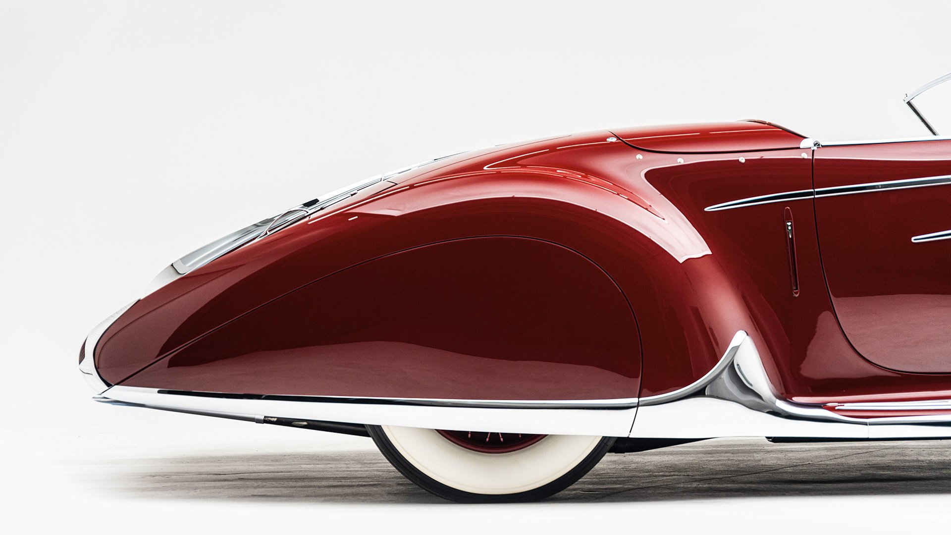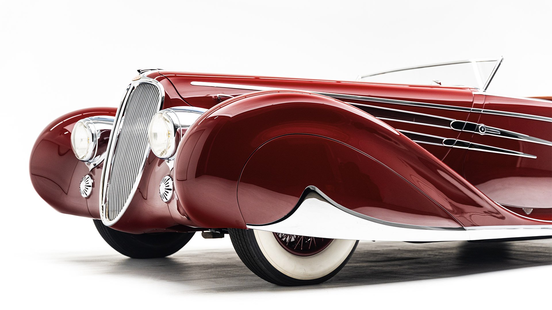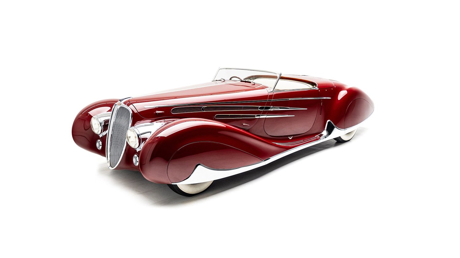 Delahaye built this roadgoing version of their successful racing Type 145 for the 1939 New York World’s Fair. Boasting the streamlined bodywork of Figoni et Falaschi, it was meant to feature a retooled 145 engine, but time constraints led it to be shipped without it. Following the outbreak of WWII, the car was fitted with a second-hand Cadillac powerplant and sold at a US auction. Peter and Merle Mullin discovered the car in a Fresno garage in 1984 and reunited it with its intended engine, making whole one of the finest examples of Art Deco automobile design.