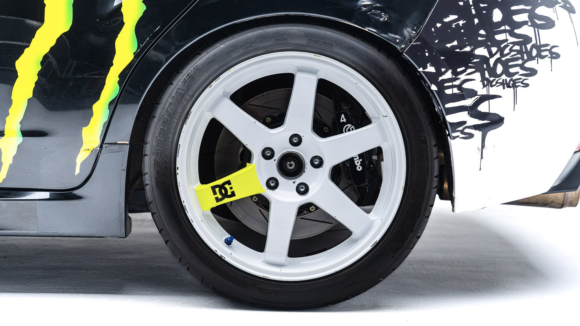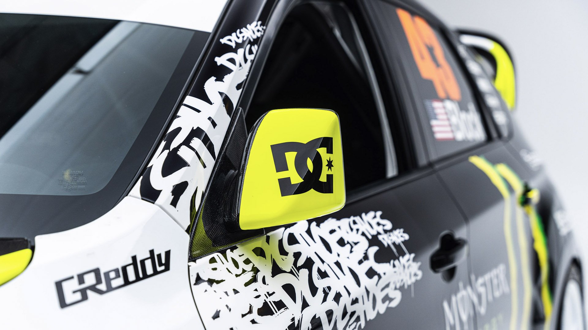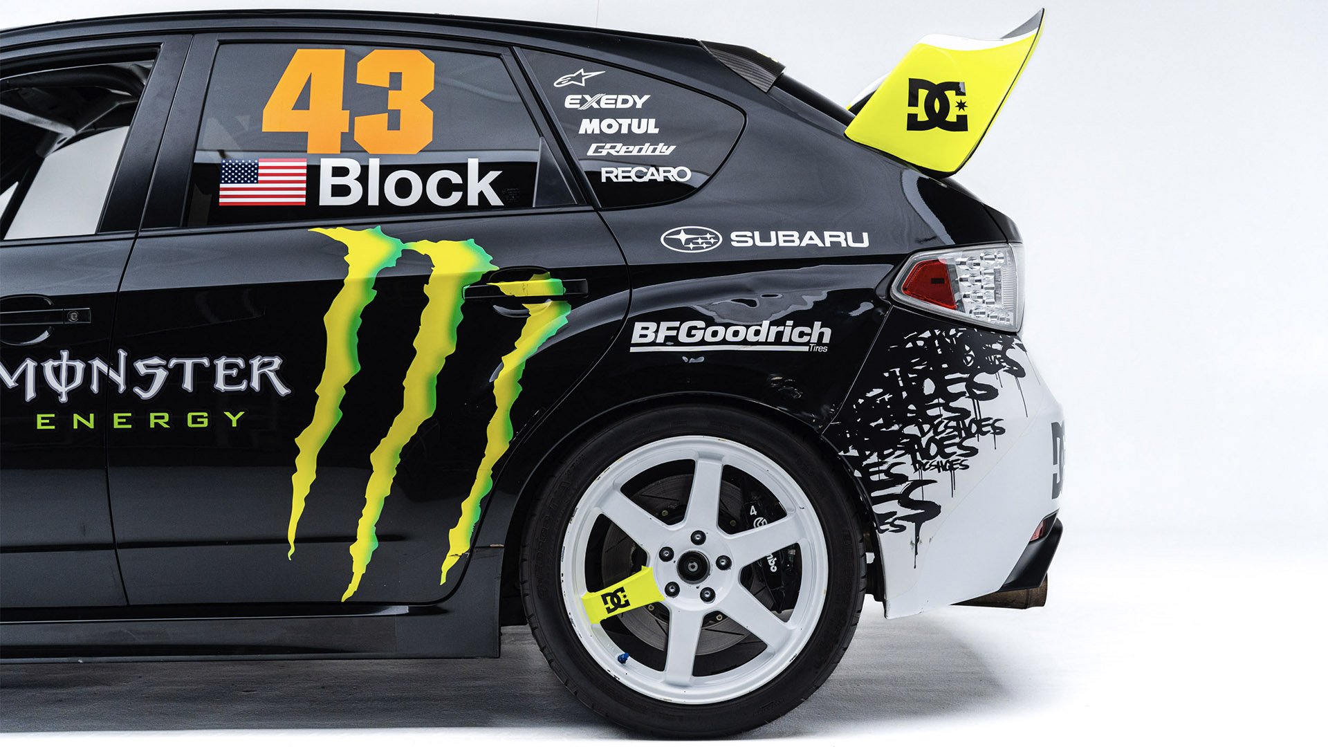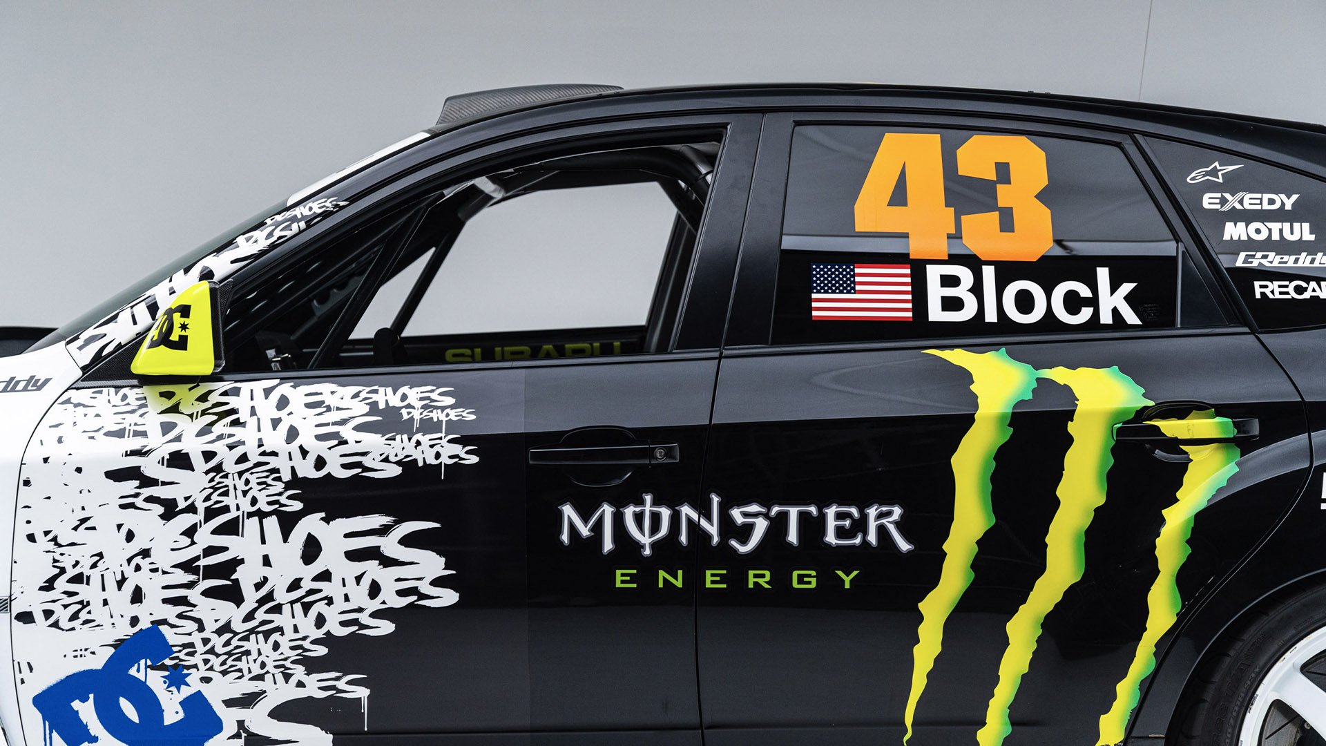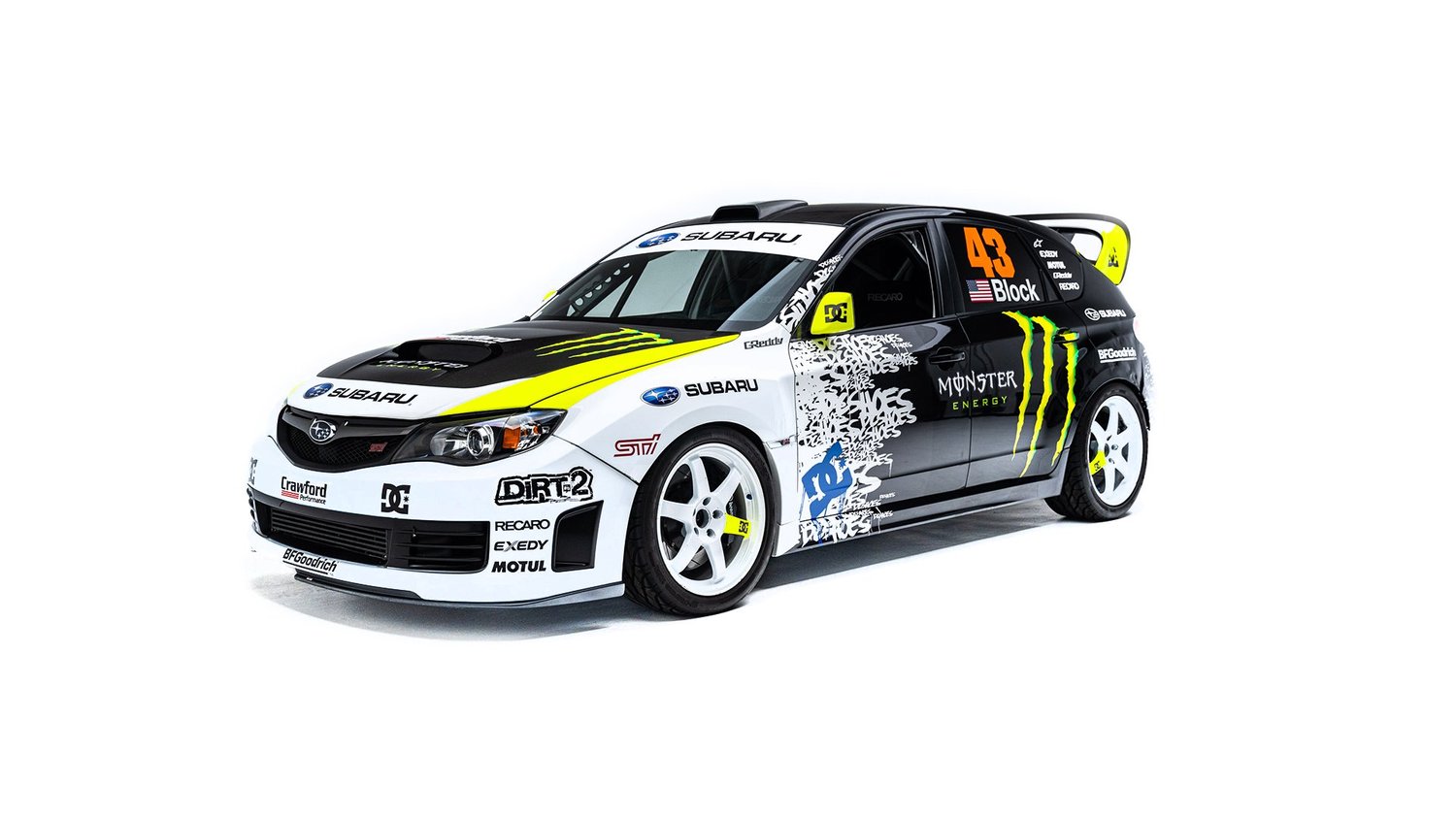 Gymkhana TWO, filmed in 2009, starred this modified Subaru WRX STI navigating obstacles in the Port of Long Beach. Though it also started as a road car, this vehicle was far more heavily modified than the one used in the first film and was the first car purpose-built for a Gymkhana video. Subtitled “The Infomercial,” Gymkhana TWO was the first of the films to promote a line of merchandise matching the vehicle's livery and Ken Block’s race suit.