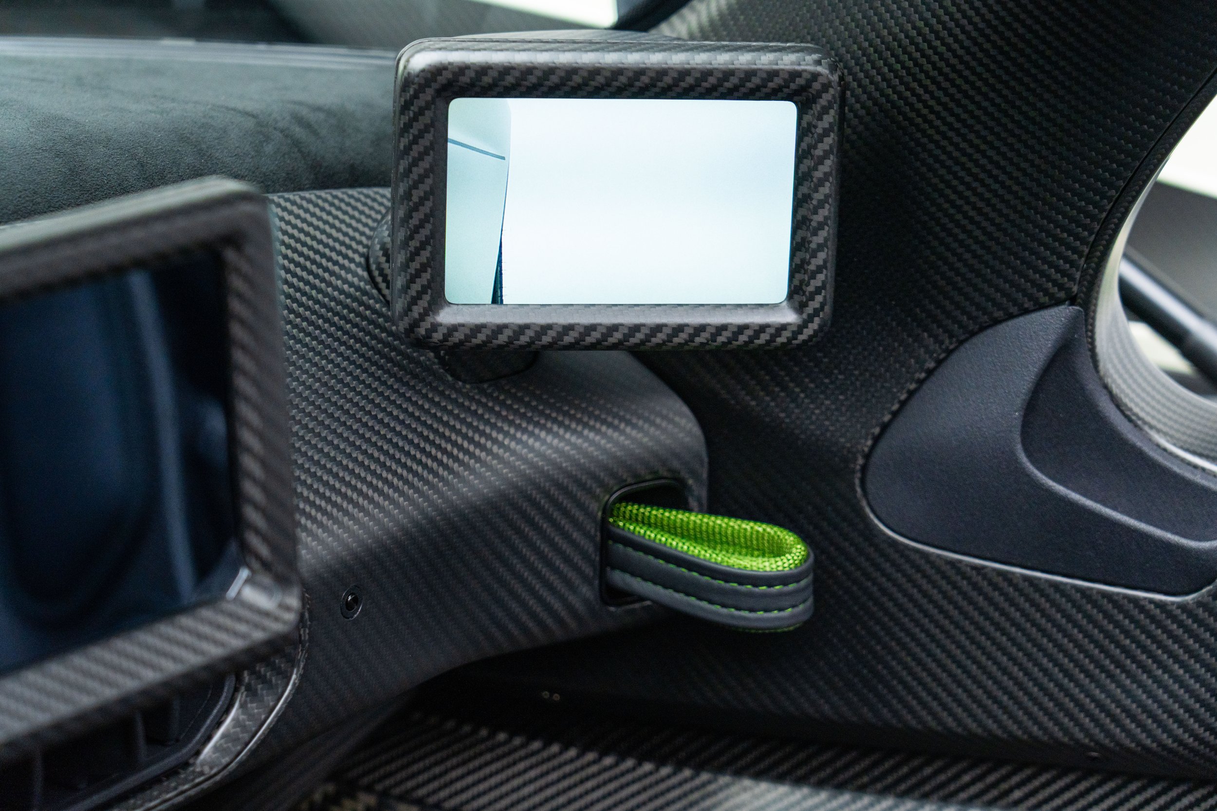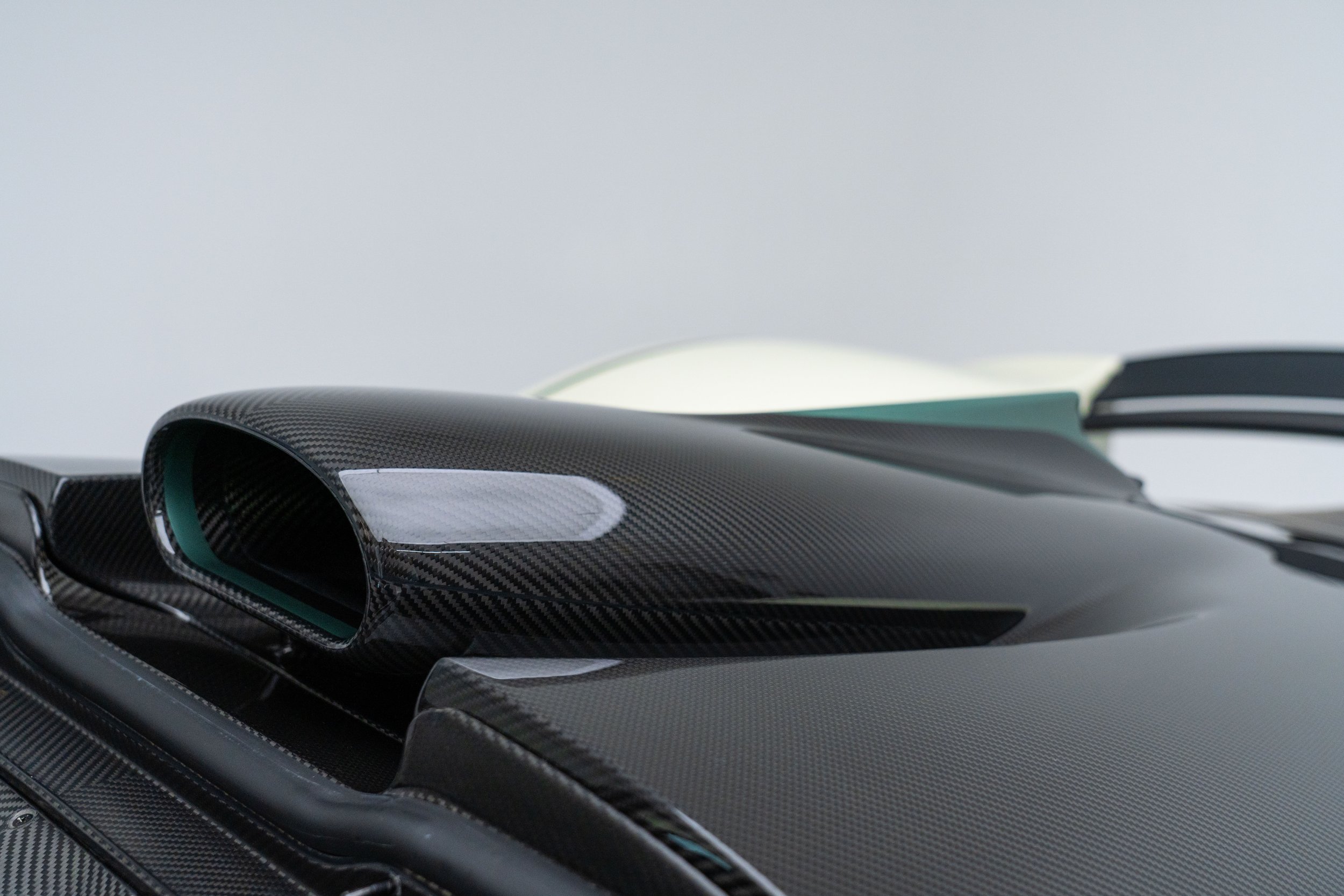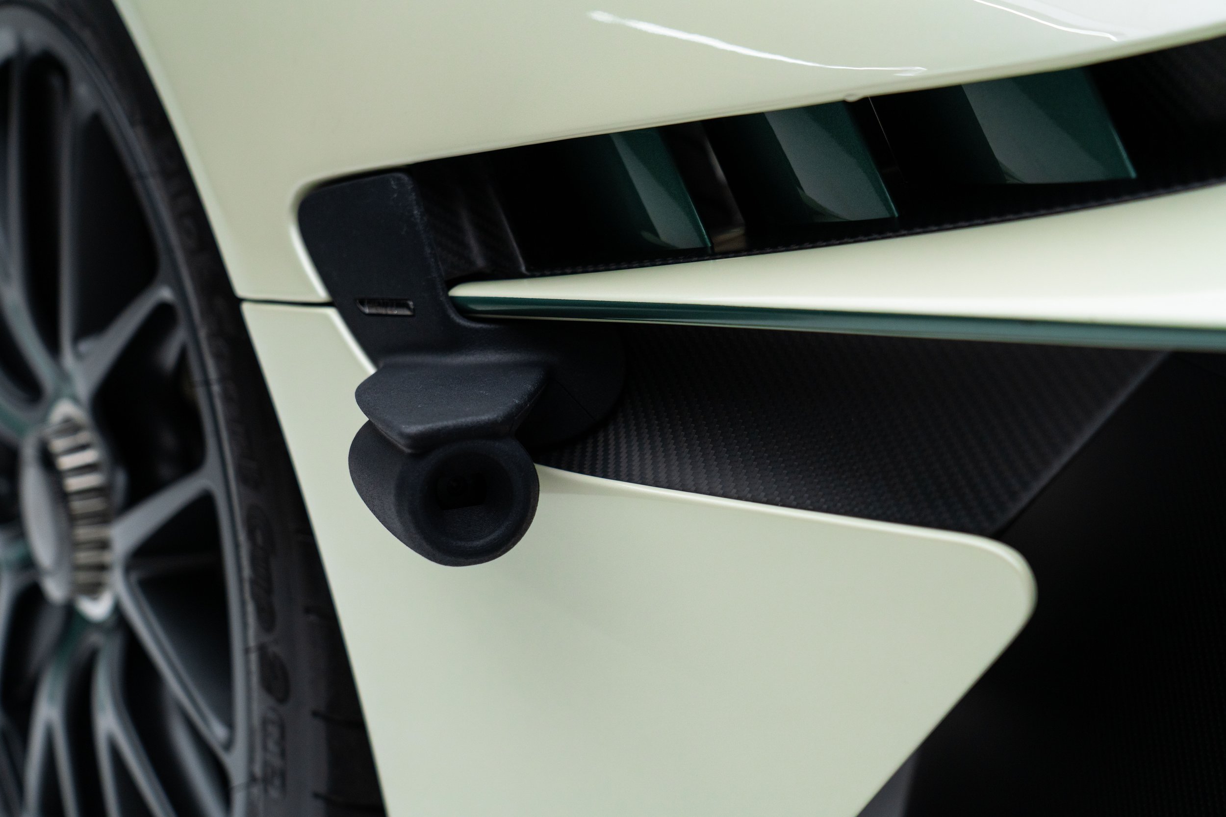 Released in 2021, Aston Martin's F1 car for the road-the Valkyrie-was developed with legendary Formula One designer Adrian Newey. Its dramatic bodywork references Aston Martin's signature design language while incorporating F1 aerodynamic void-like forms. It is constructed entirely of carbon fiber with multiple Venturi tunnels on either side of the cockpit floor. These draw air beneath the vehicle to feed the rear diffuser, keeping the upper surfaces free from drag-inducing aerodynamic elements, and generating 2,400 Ibs of downforce.
