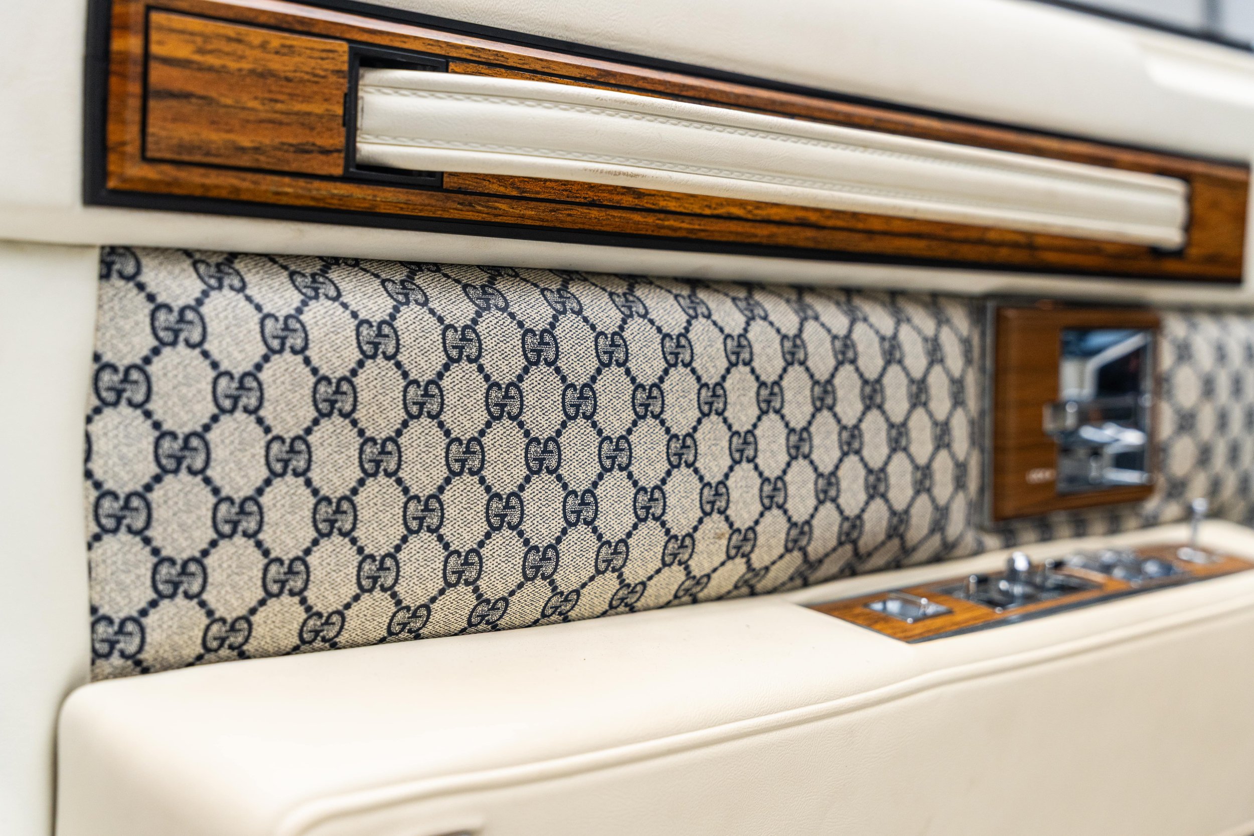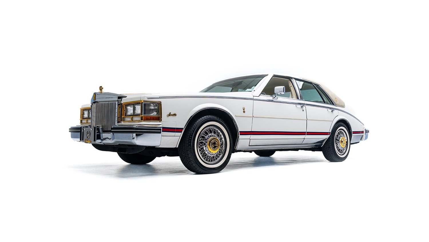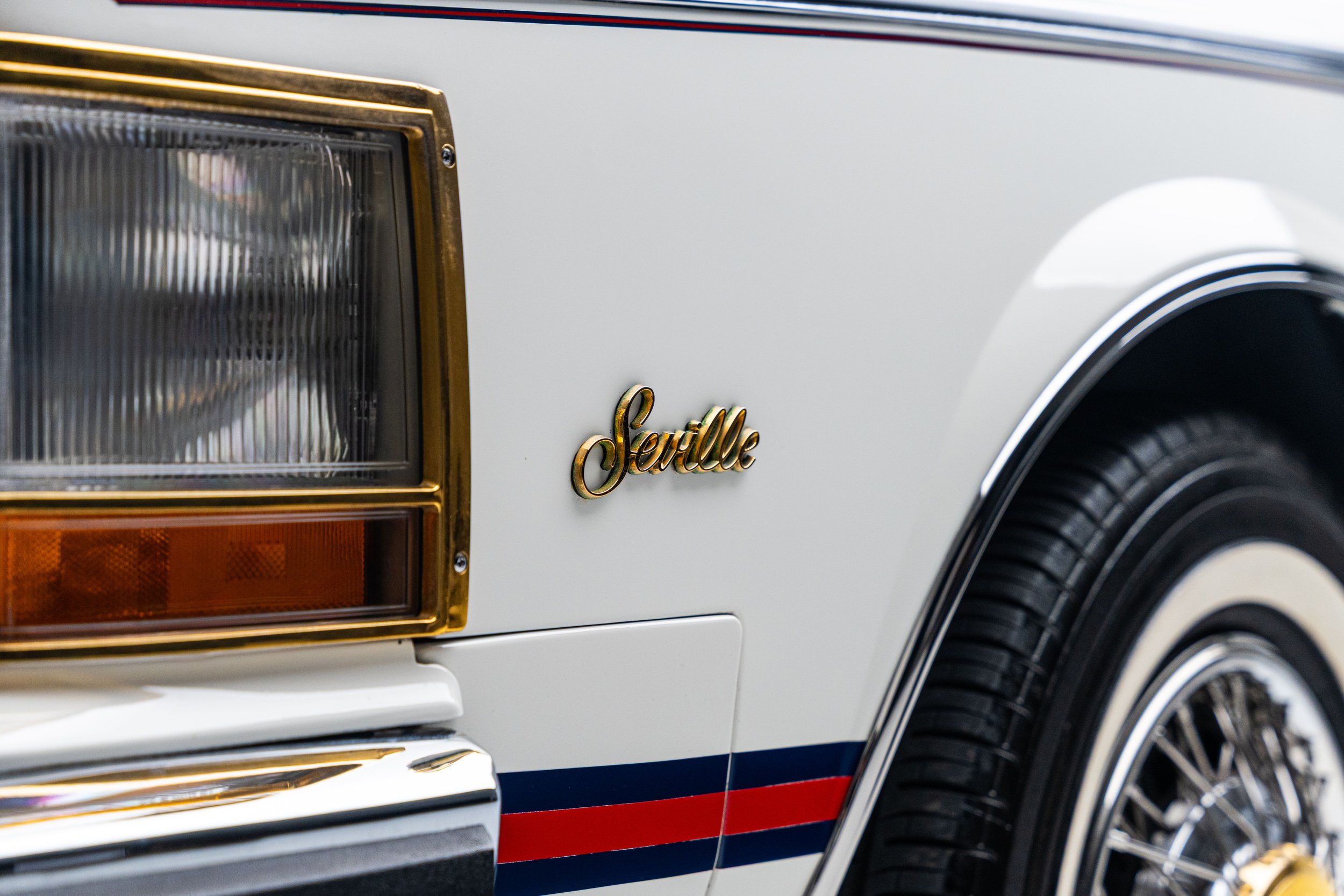 Manufactured at the peak of the "Malaise Era," the second-generation Cadillac Seville, introduced in 1980, was a mix of novel technology and classical design. While its modestly styled predecessor was meant to appeal to a younger clientele, the distinctive new Seville targeted an older market nostalgic for the luxury cars of their youth. Its prominent “bustle-back” rear end was inspired by prewar Rolls-Royces. After experiencing reliability issues and mixed reviews for the outdated look, the Seville was redesigned for 1986. Continuing a 1970s trend of fashion designer–automaker collaborations, in 1978 General Motors, Gucci, and Miami dealer Braman Cadillac partnered to create a special limited edition of the Seville with modifications designed by Aldo Gucci. These included a Gucci-patterned vinyl roof, monogrammed upholstery, custom wheels, and red and blue striping. A second-generation Seville by Gucci was even more exclusive and flamboyant than the first. It is unknown how many were built, but the car on display is believed to be one of fewer than ten survivors.