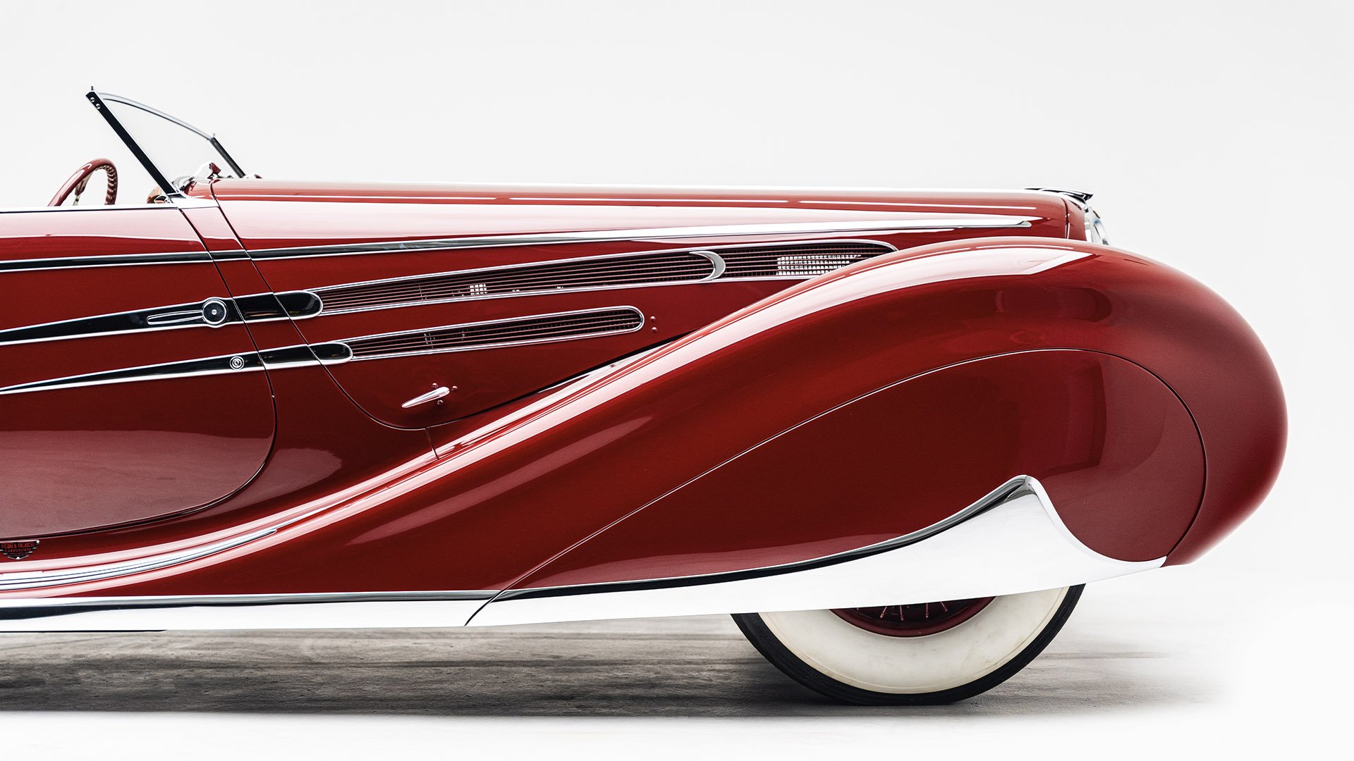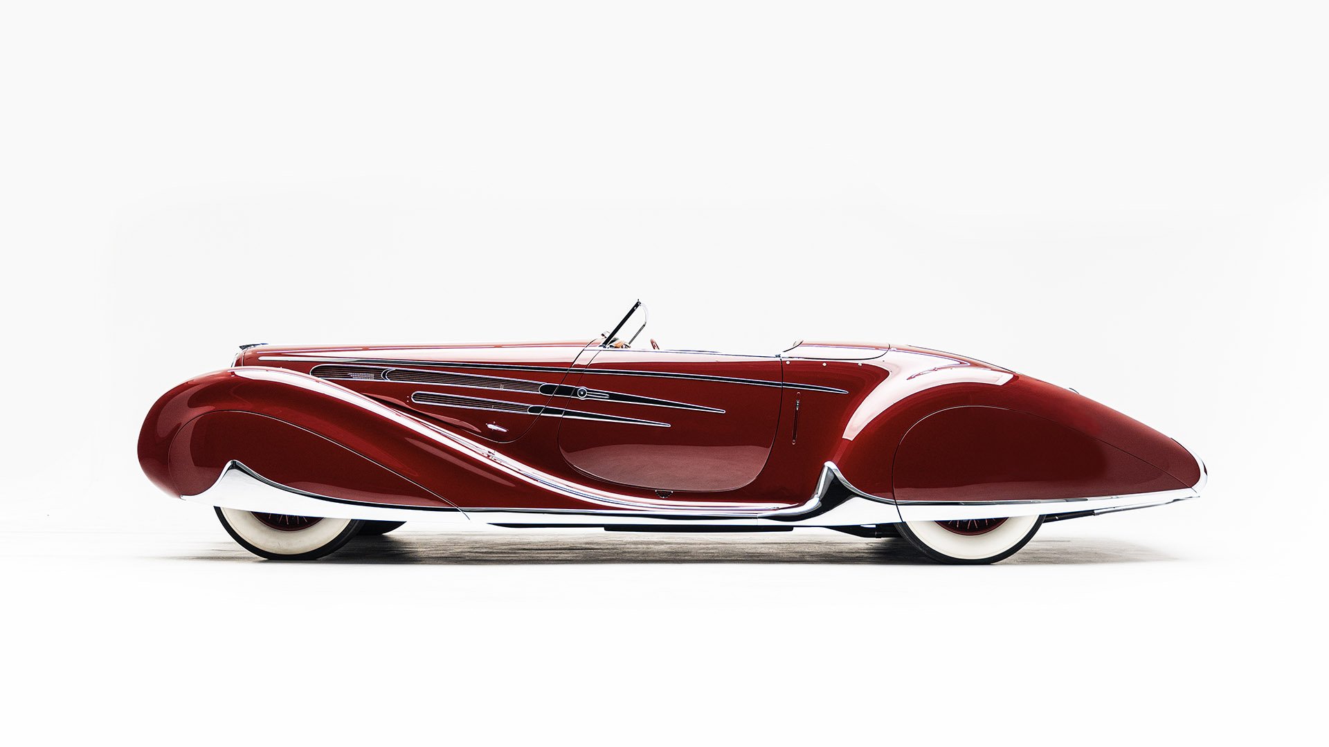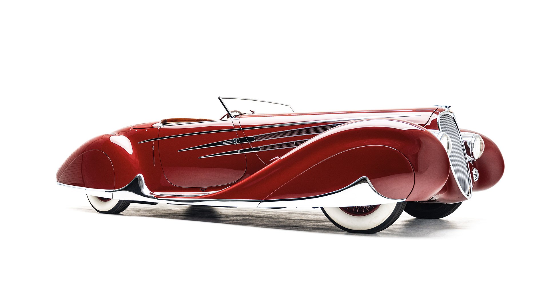 Delahaye built this roadgoing version of their successful racing Type 145 for the 1939 New York World’s Fair. Boasting the streamlined bodywork of Figoni et Falaschi, it was meant to feature a retooled 145 engine, but time constraints led it to be shipped without it. Following the outbreak of WWII, the car was fitted with a second-hand Cadillac powerplant and sold at a US auction. Peter and Merle Mullin discovered the car in a Fresno garage in 1984 and reunited it with its intended engine, making whole one of the finest examples of Art Deco automobile design.