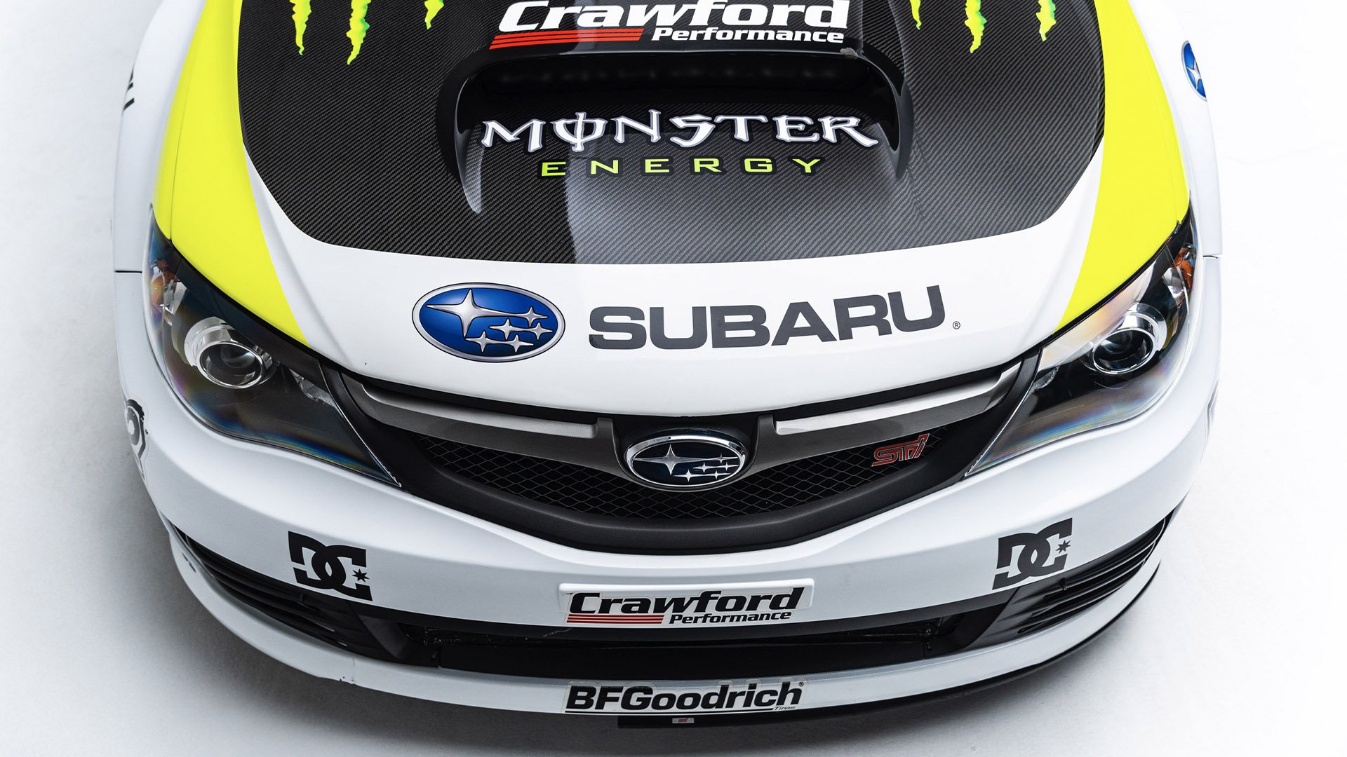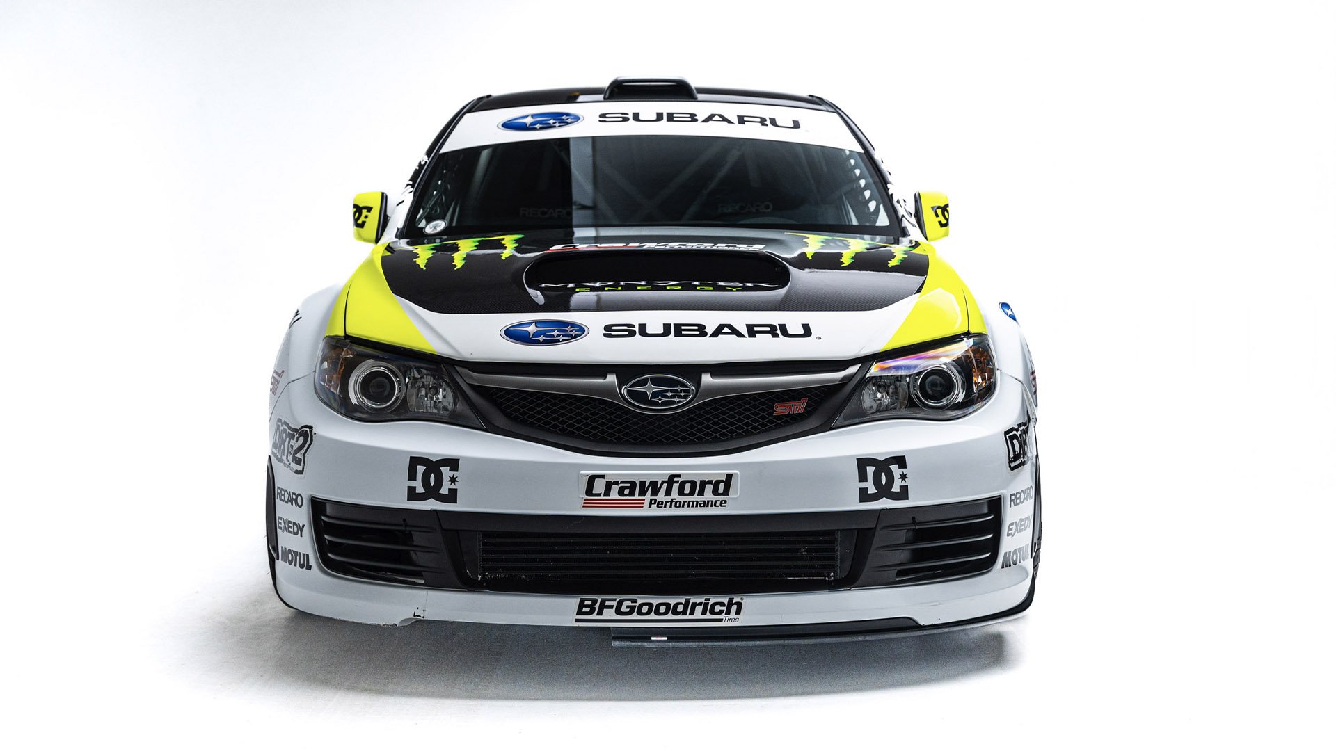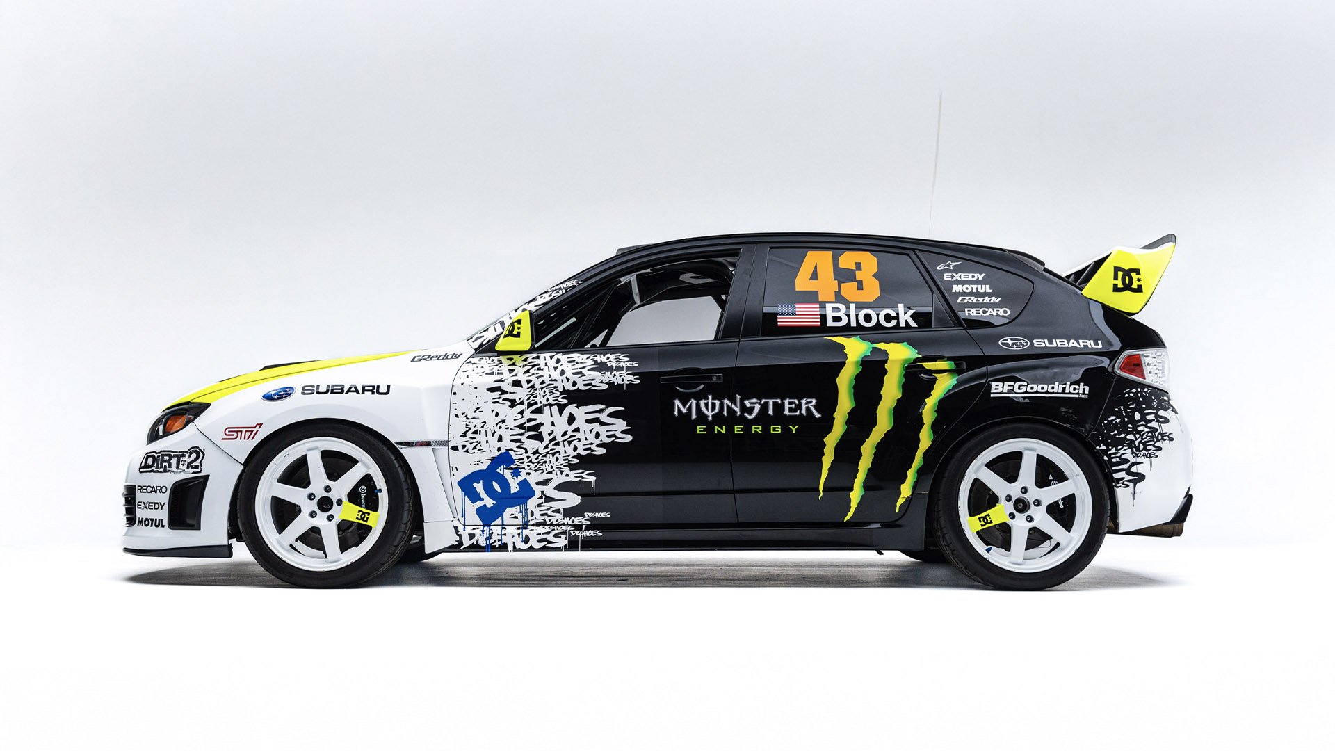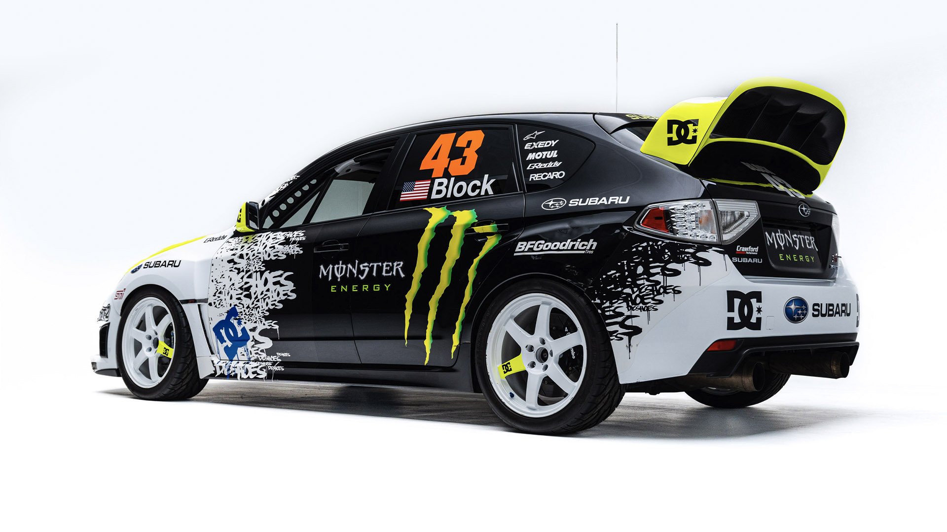 Gymkhana TWO, filmed in 2009, starred this modified Subaru WRX STI navigating obstacles in the Port of Long Beach. Though it also started as a road car, this vehicle was far more heavily modified than the one used in the first film and was the first car purpose-built for a Gymkhana video. Subtitled “The Infomercial,” Gymkhana TWO was the first of the films to promote a line of merchandise matching the vehicle's livery and Ken Block’s race suit.