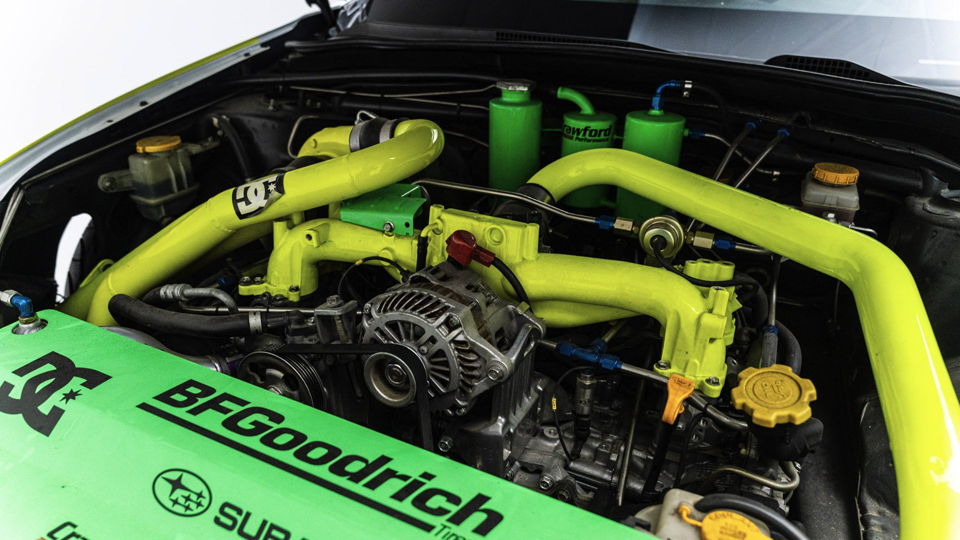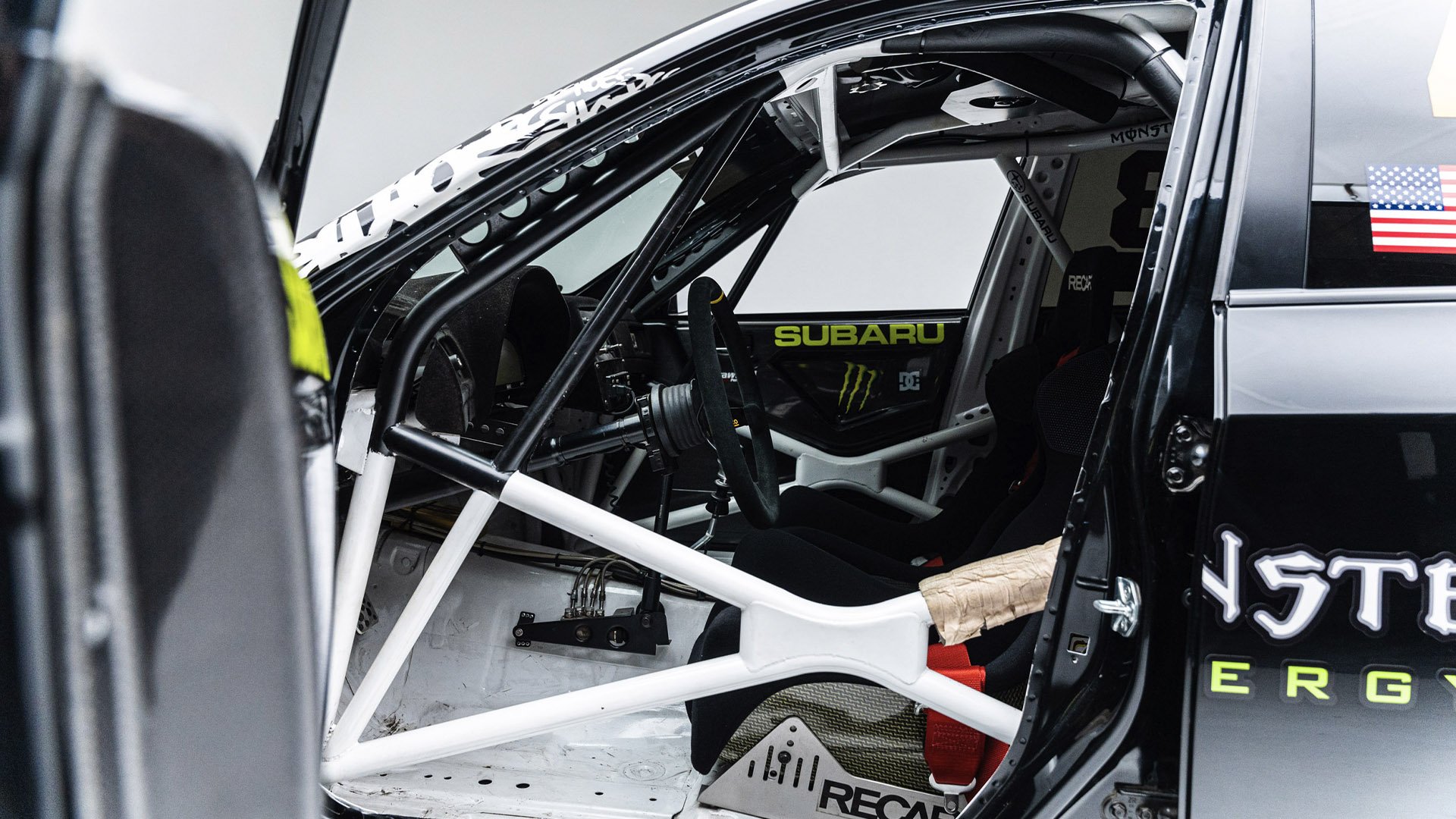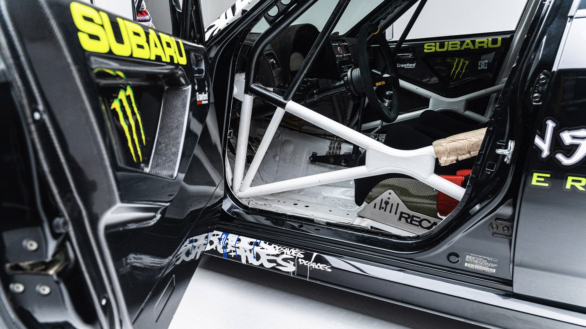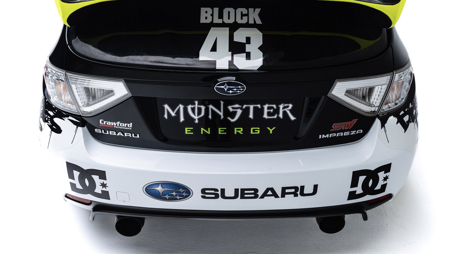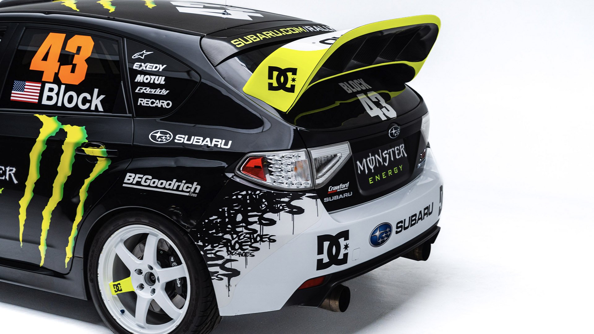 Gymkhana TWO, filmed in 2009, starred this modified Subaru WRX STI navigating obstacles in the Port of Long Beach. Though it also started as a road car, this vehicle was far more heavily modified than the one used in the first film and was the first car purpose-built for a Gymkhana video. Subtitled “The Infomercial,” Gymkhana TWO was the first of the films to promote a line of merchandise matching the vehicle's livery and Ken Block’s race suit.