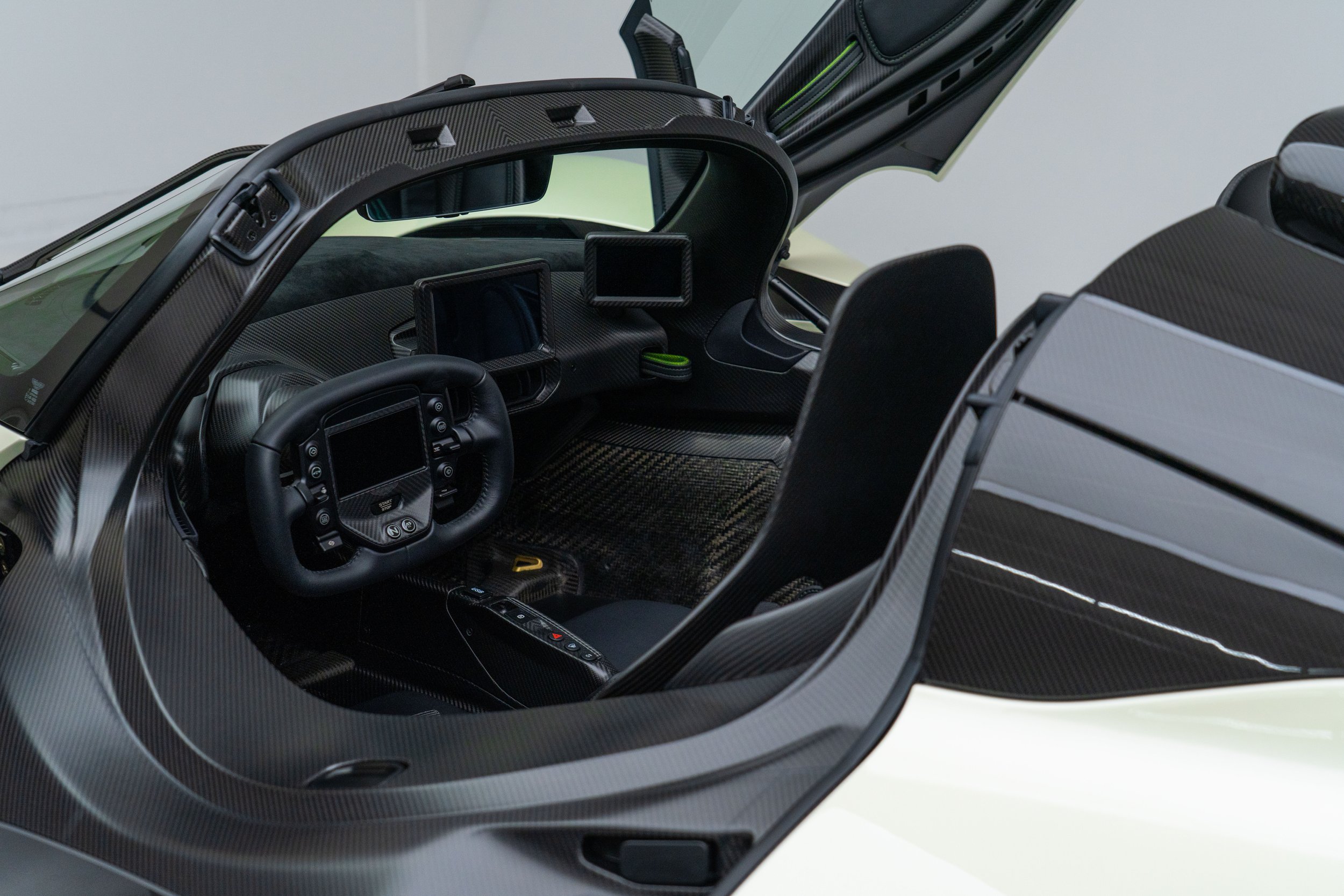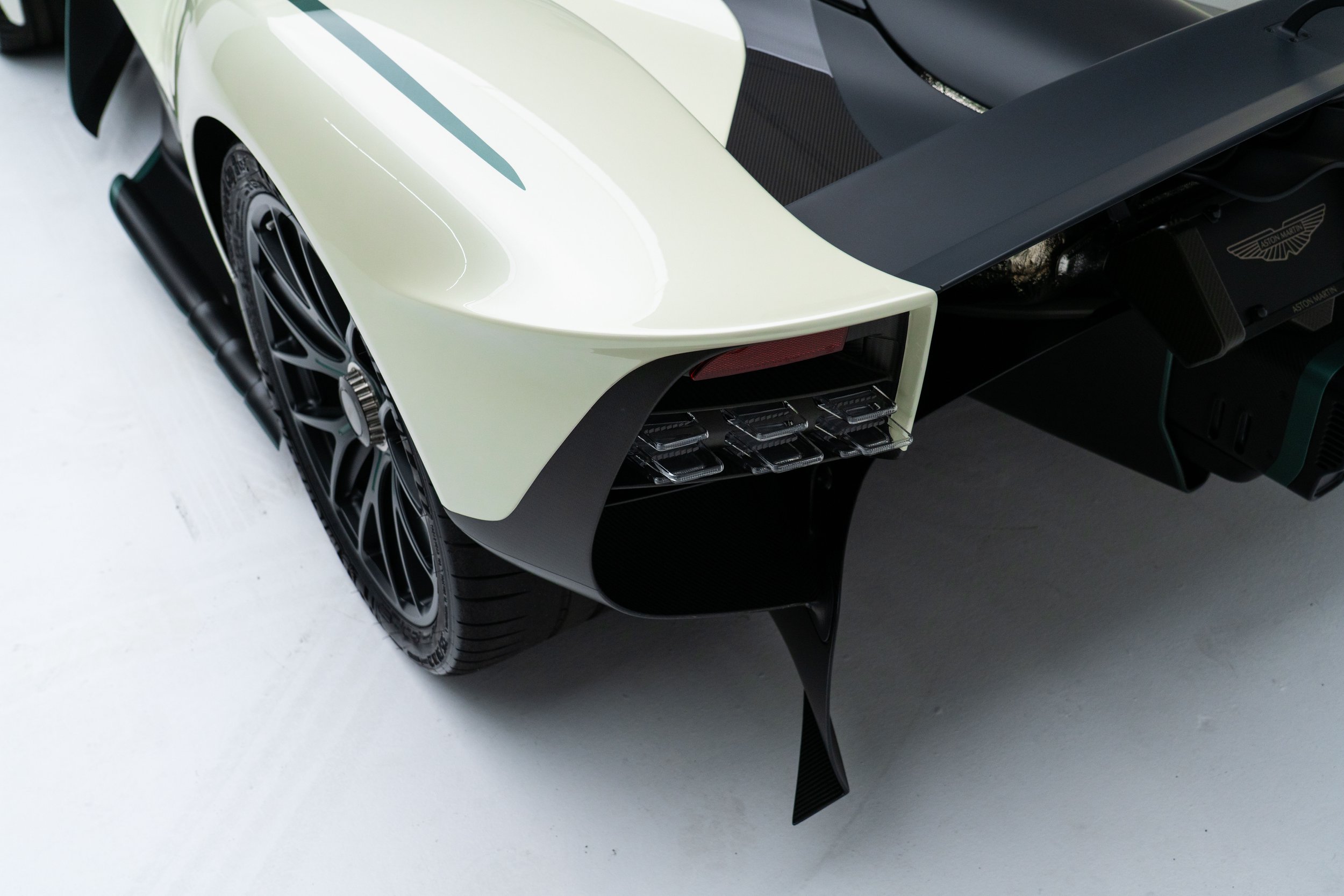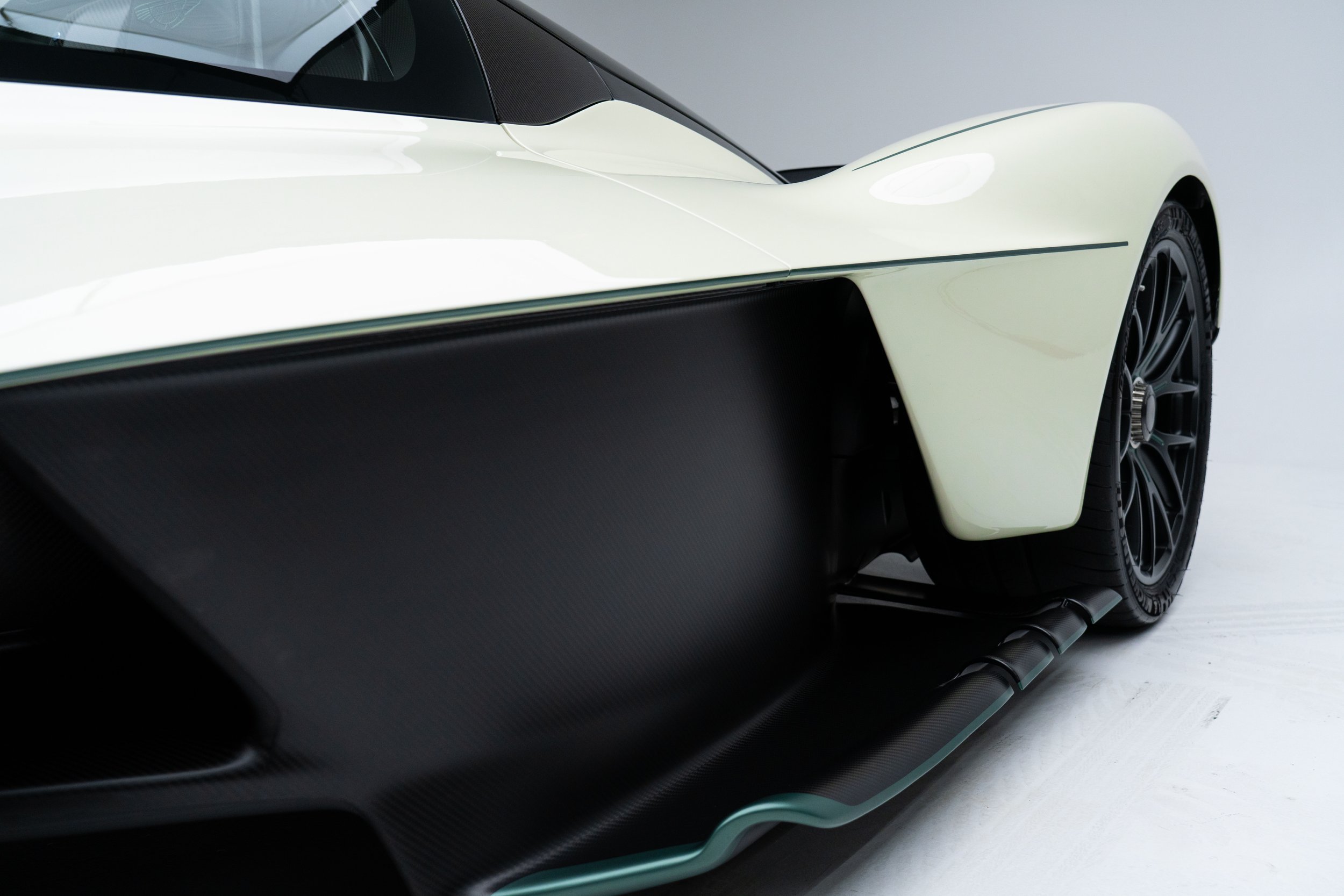 Released in 2021, Aston Martin's F1 car for the road-the Valkyrie-was developed with legendary Formula One designer Adrian Newey. Its dramatic bodywork references Aston Martin's signature design language while incorporating F1 aerodynamic void-like forms. It is constructed entirely of carbon fiber with multiple Venturi tunnels on either side of the cockpit floor. These draw air beneath the vehicle to feed the rear diffuser, keeping the upper surfaces free from drag-inducing aerodynamic elements, and generating 2,400 Ibs of downforce.
