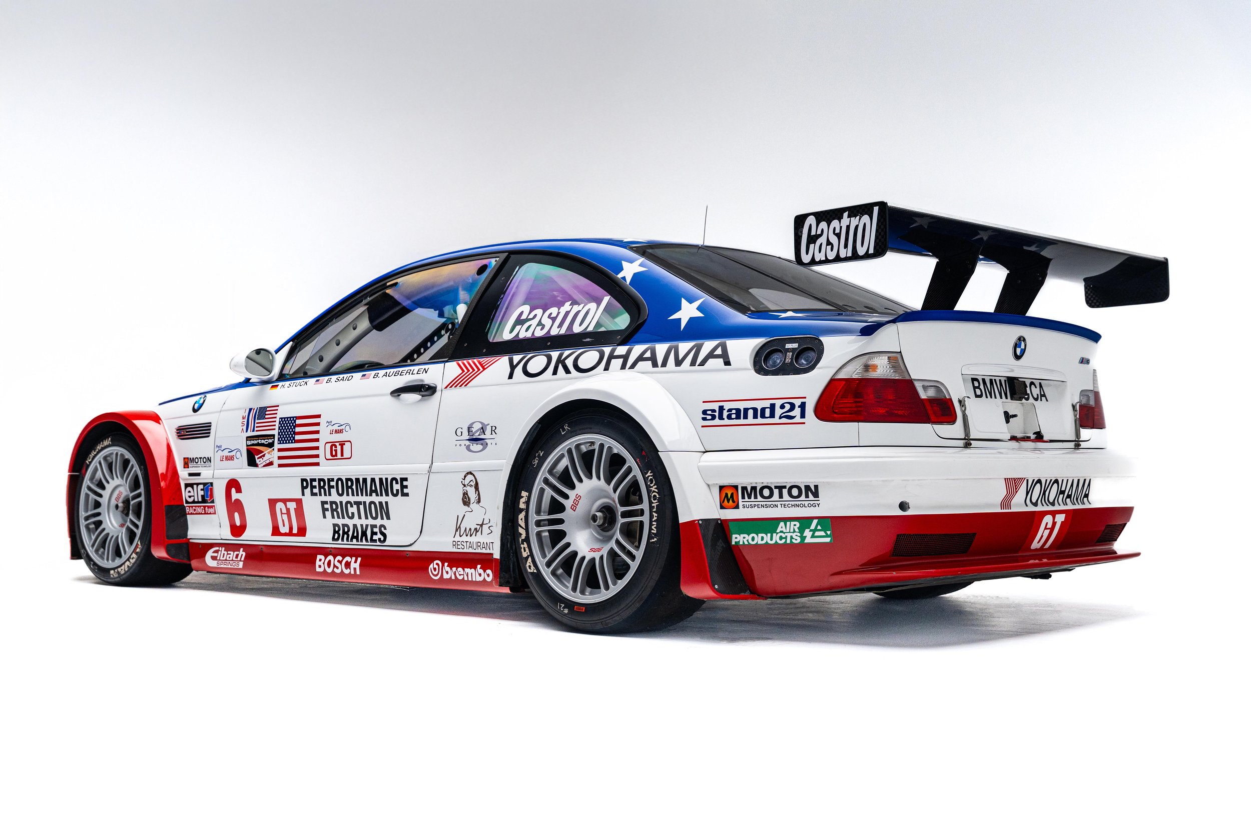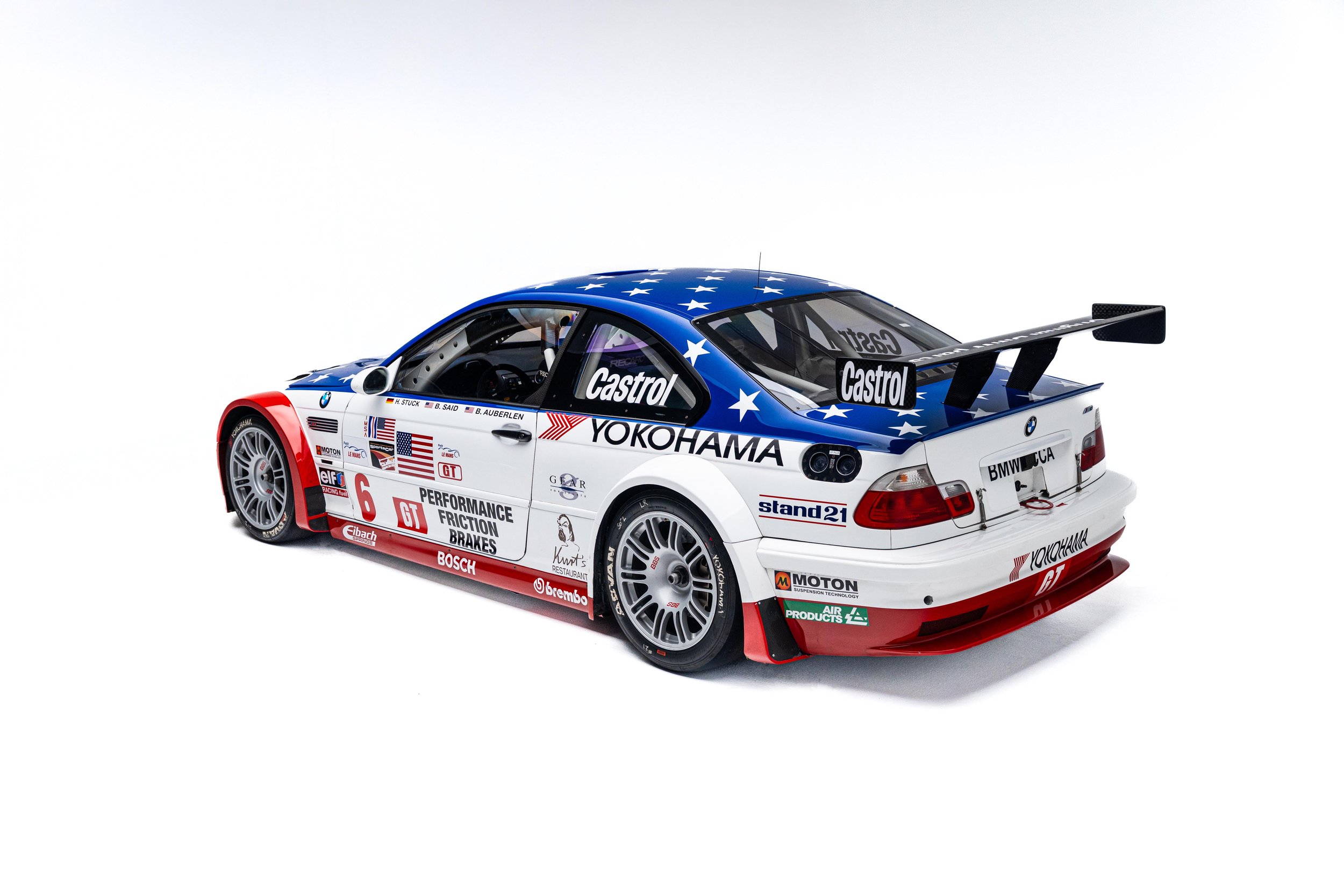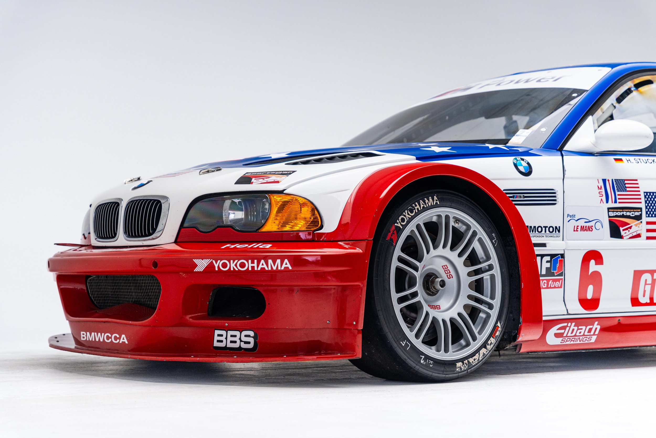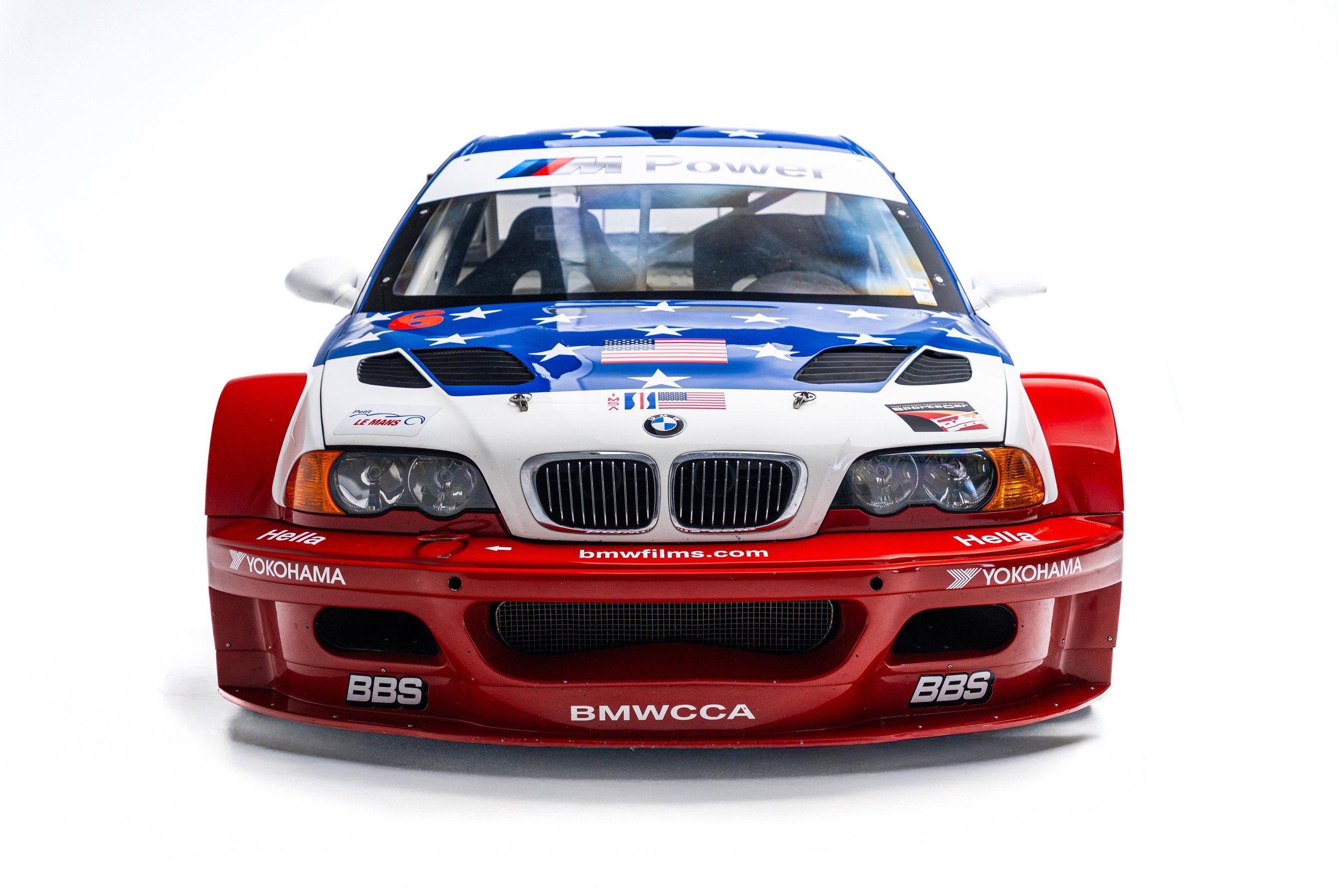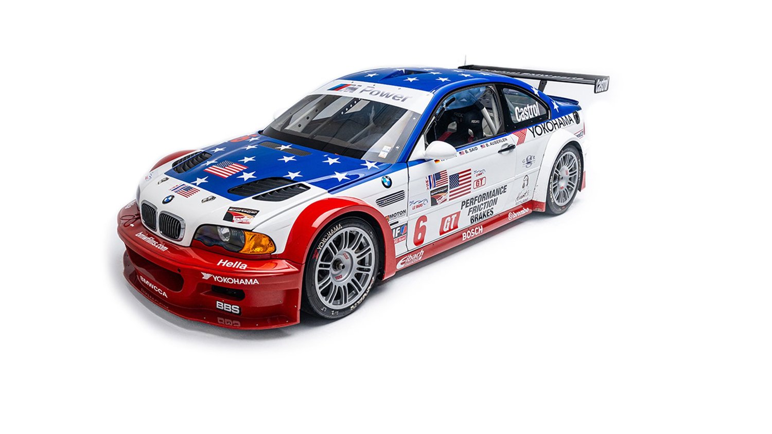 Based on the third-generation M3 (E46), the M3 GTR was developed for racing in the 2001 season of the American Le Mans Series (ALMS), which briefly allowed manufacturers to use race cars with purpose-built racing engines, provided a small number of equivalent roadgoing examples were built. These rules were changed for the following season but not before the M3 GTR won the Manufacturers’, Teams’, and Drivers’ Championships. The M3 GTR race car achieved cult status as the central vehicle in the story of the popular 2005 racing video game Need for Speed: Most Wanted. To celebrate the game’s 20th anniversary, BMW M wrapped one of its real M3 GTR race cars to resemble the one in the game. This example’s stars-and-stripes livery was designed to honor America in the immediate aftermath of the September 11th attacks.