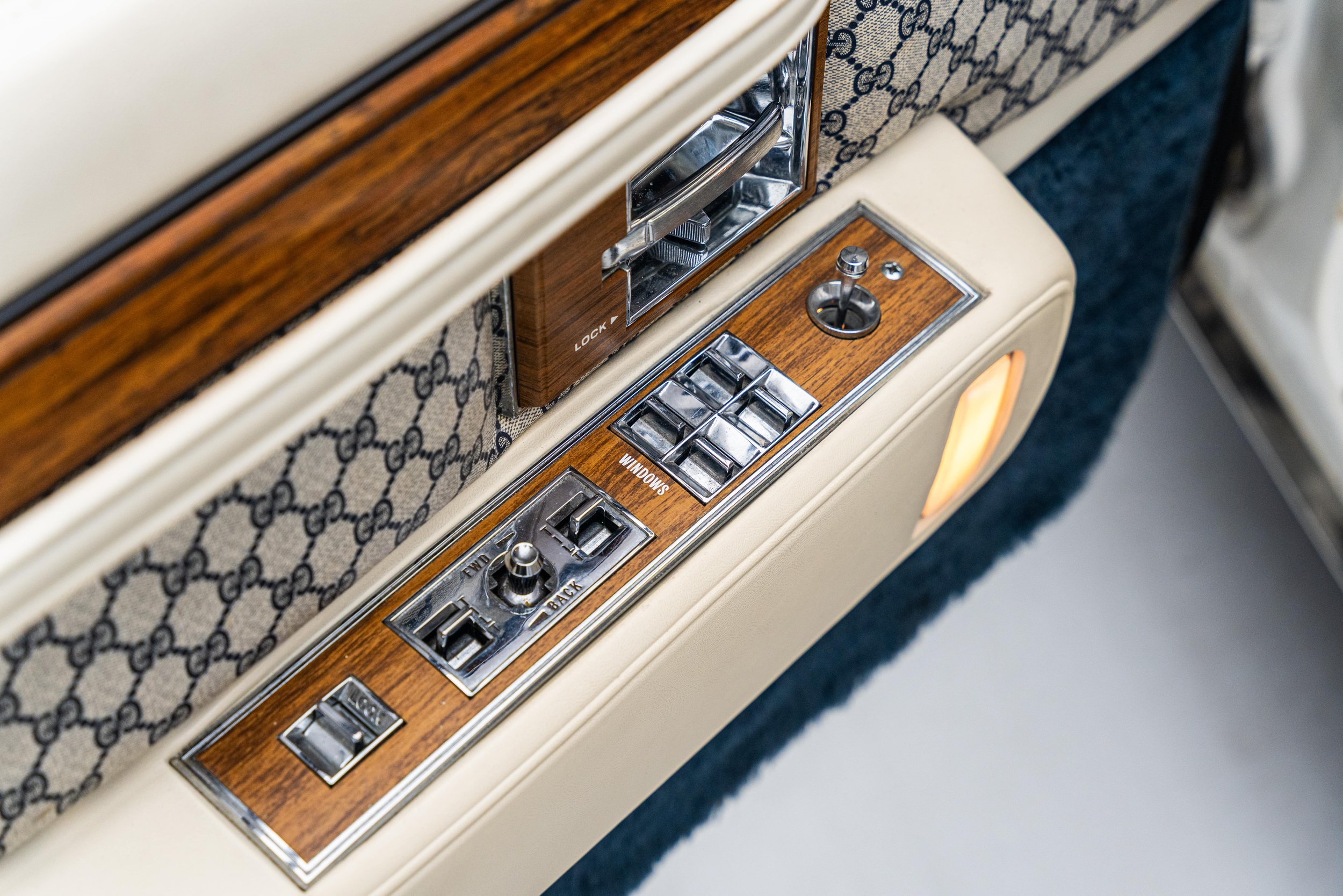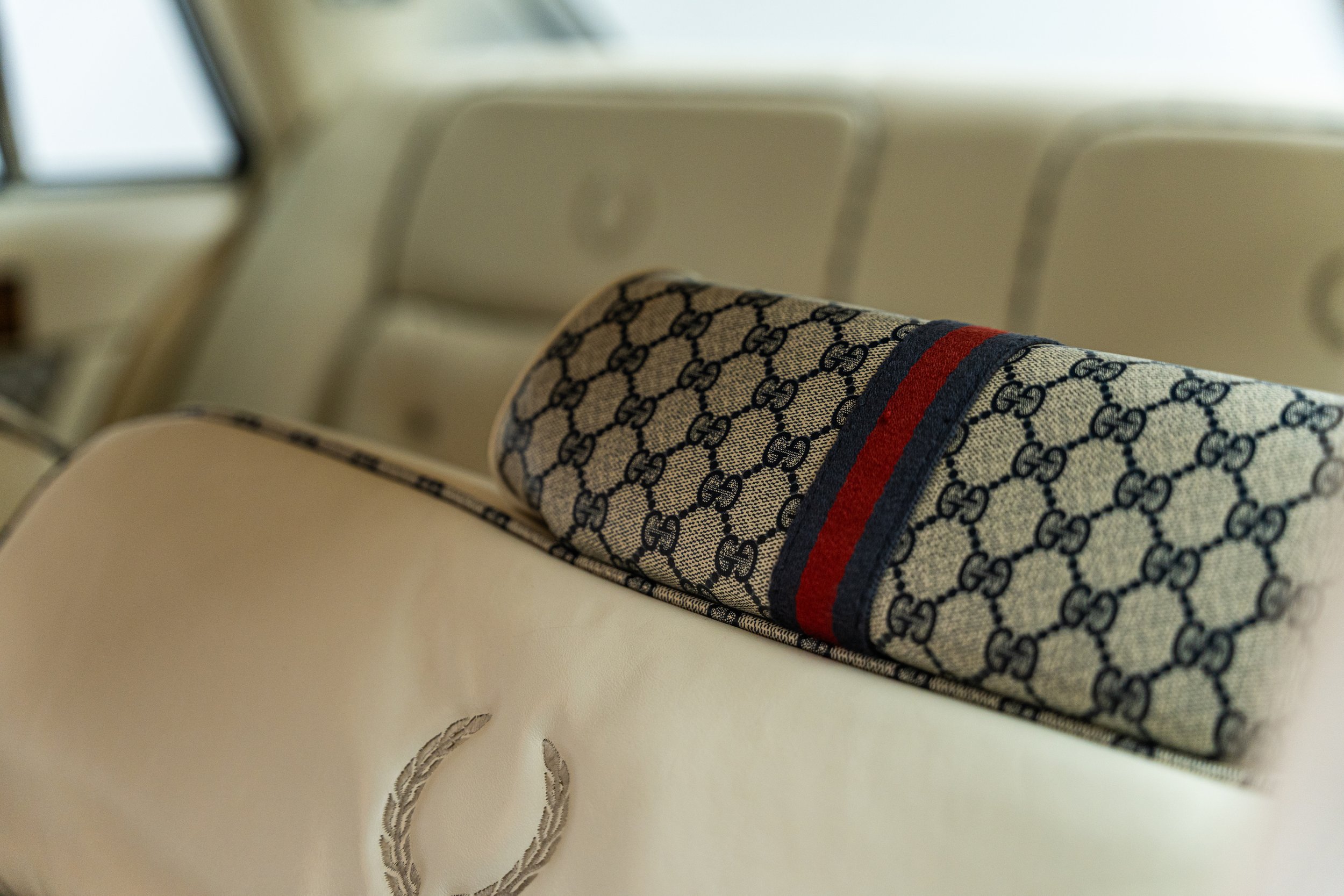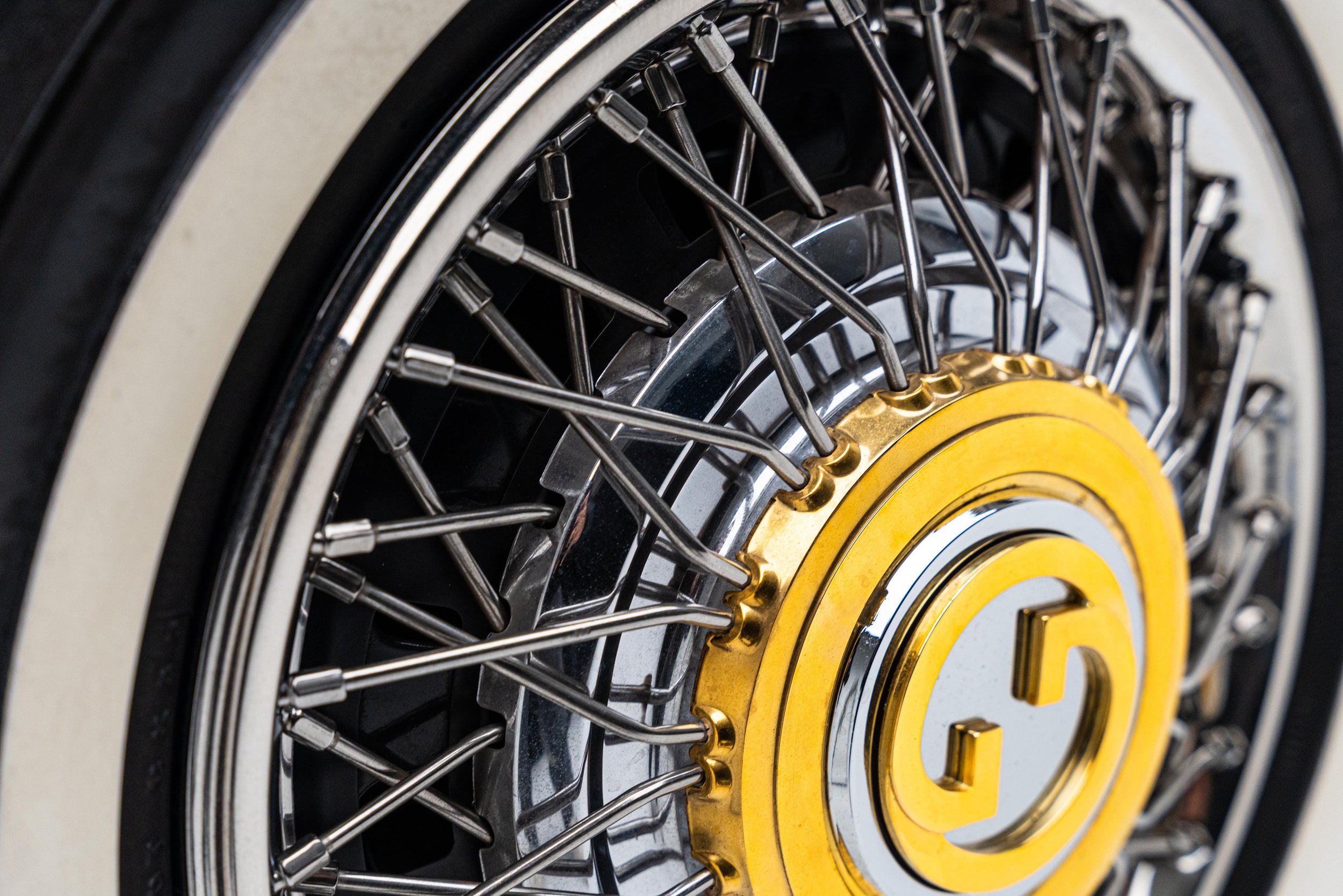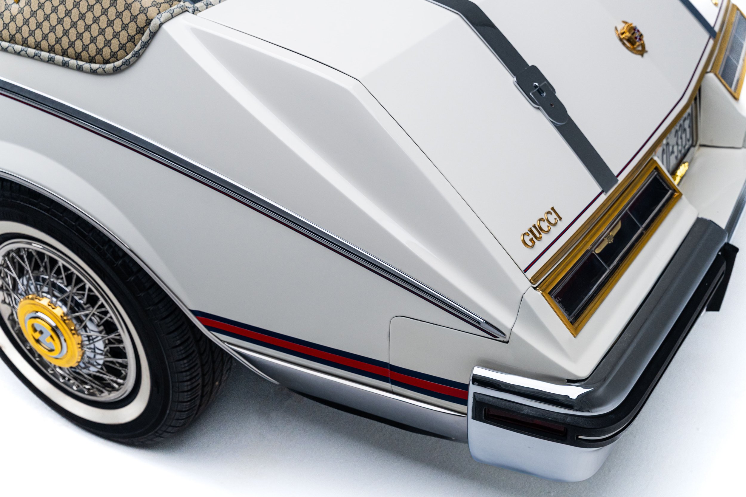 Manufactured at the peak of the "Malaise Era," the second-generation Cadillac Seville, introduced in 1980, was a mix of novel technology and classical design. While its modestly styled predecessor was meant to appeal to a younger clientele, the distinctive new Seville targeted an older market nostalgic for the luxury cars of their youth. Its prominent “bustle-back” rear end was inspired by prewar Rolls-Royces. After experiencing reliability issues and mixed reviews for the outdated look, the Seville was redesigned for 1986. Continuing a 1970s trend of fashion designer–automaker collaborations, in 1978 General Motors, Gucci, and Miami dealer Braman Cadillac partnered to create a special limited edition of the Seville with modifications designed by Aldo Gucci. These included a Gucci-patterned vinyl roof, monogrammed upholstery, custom wheels, and red and blue striping. A second-generation Seville by Gucci was even more exclusive and flamboyant than the first. It is unknown how many were built, but the car on display is believed to be one of fewer than ten survivors.