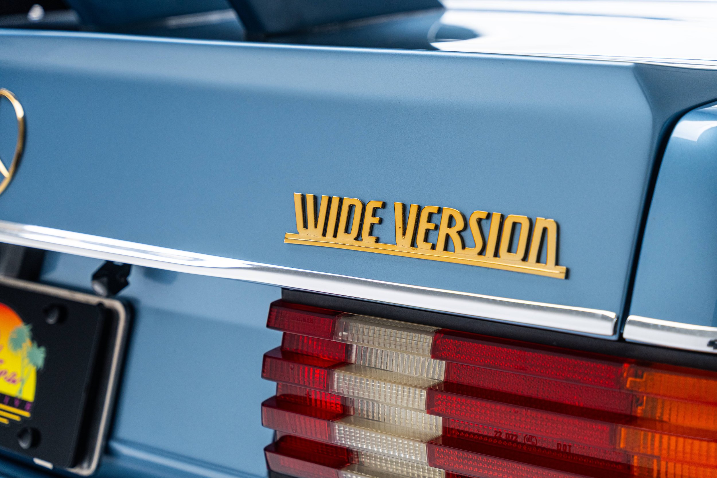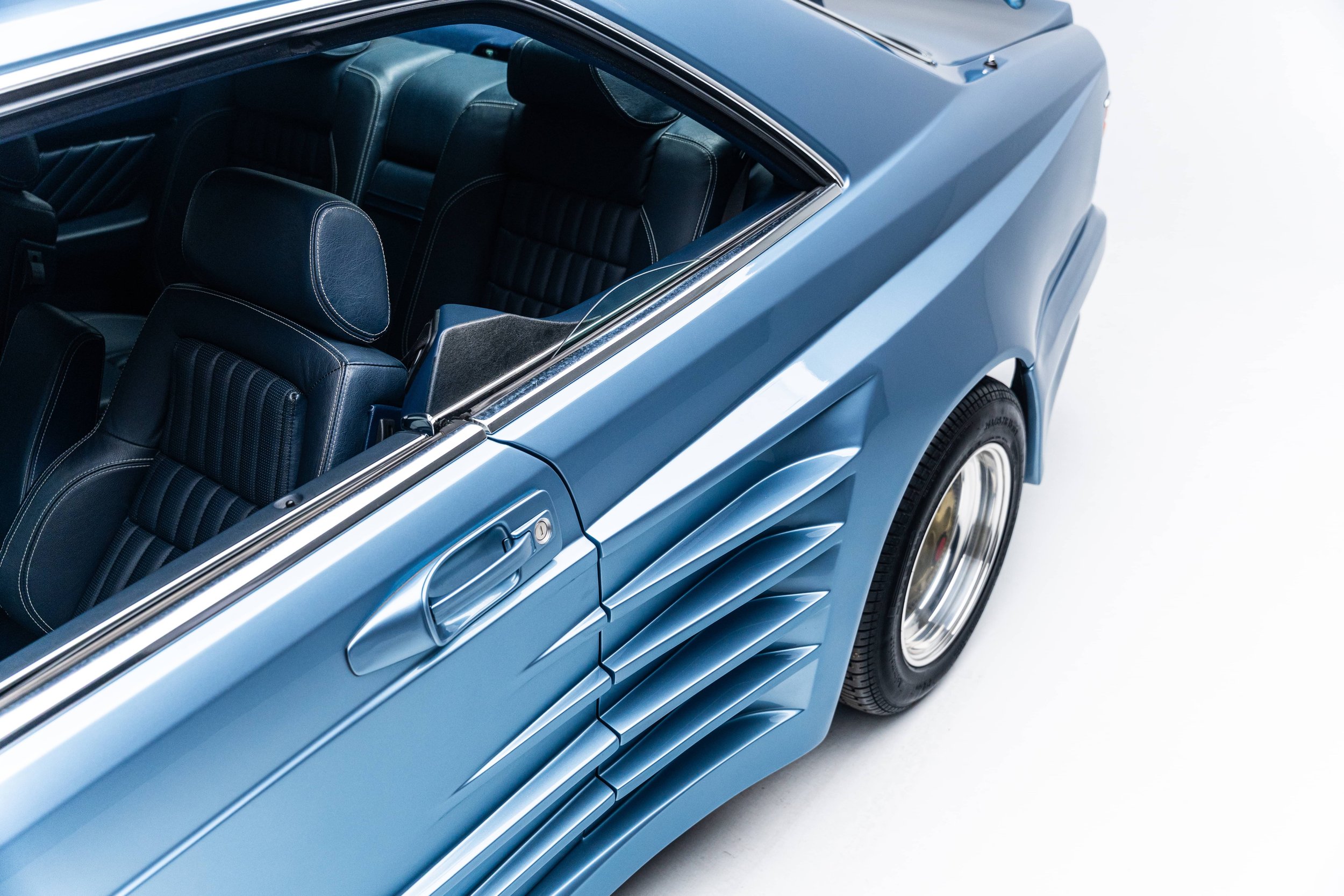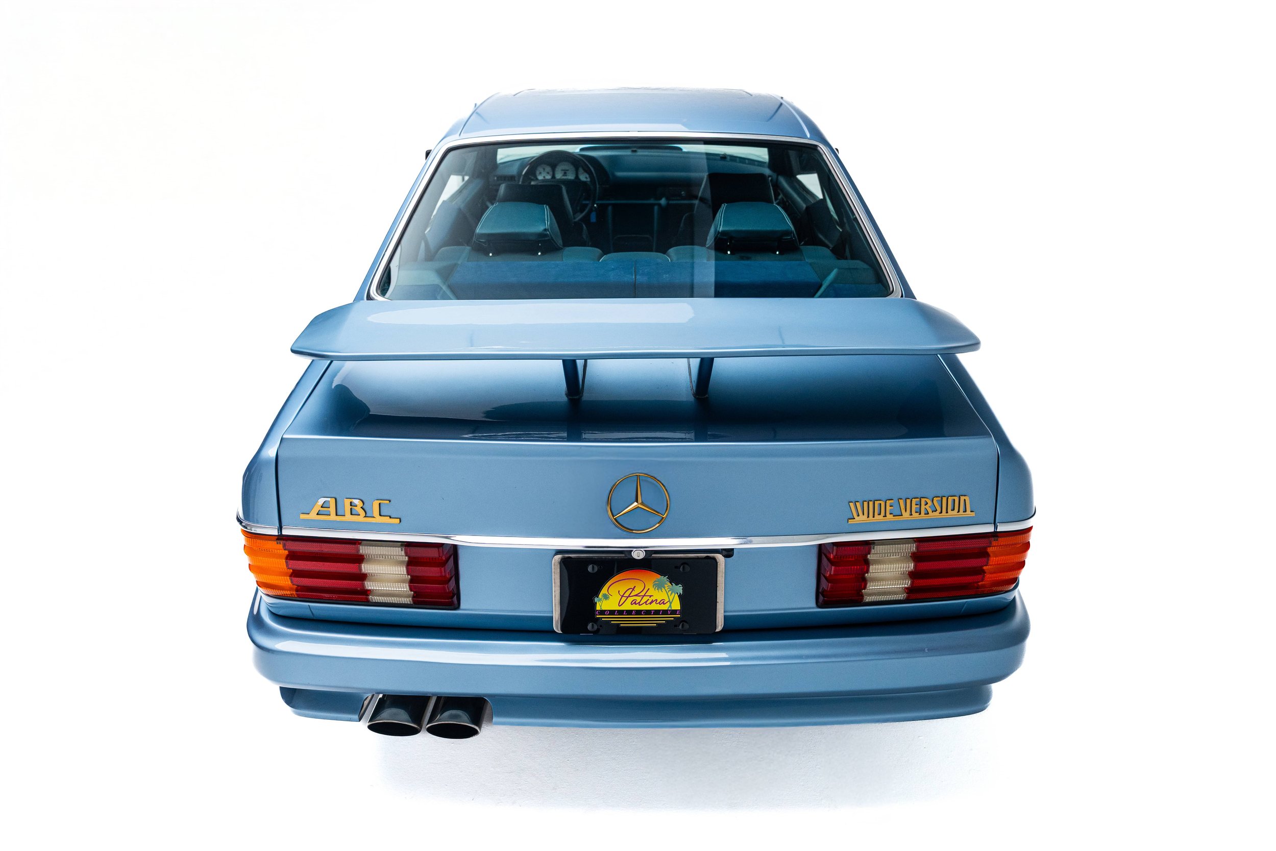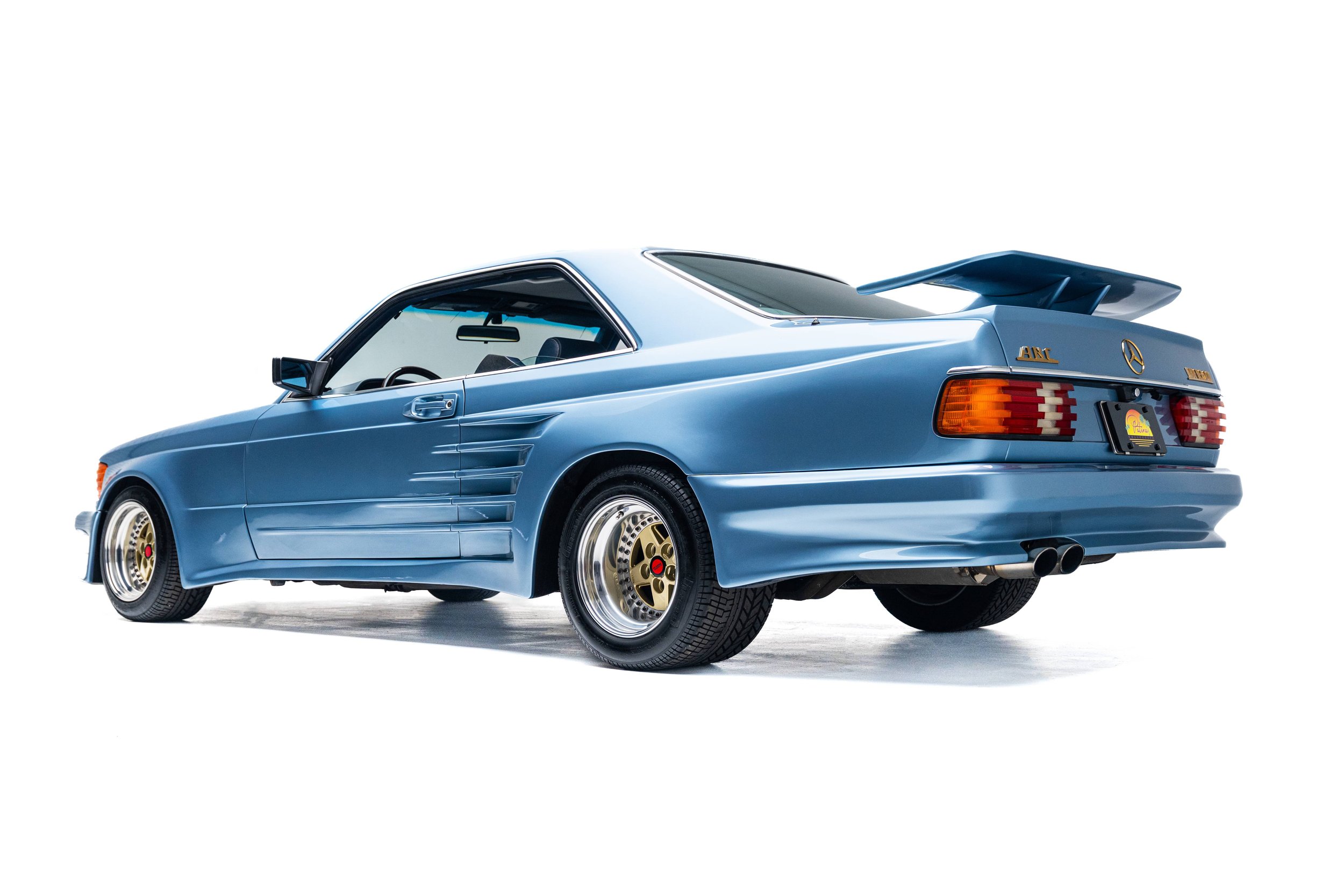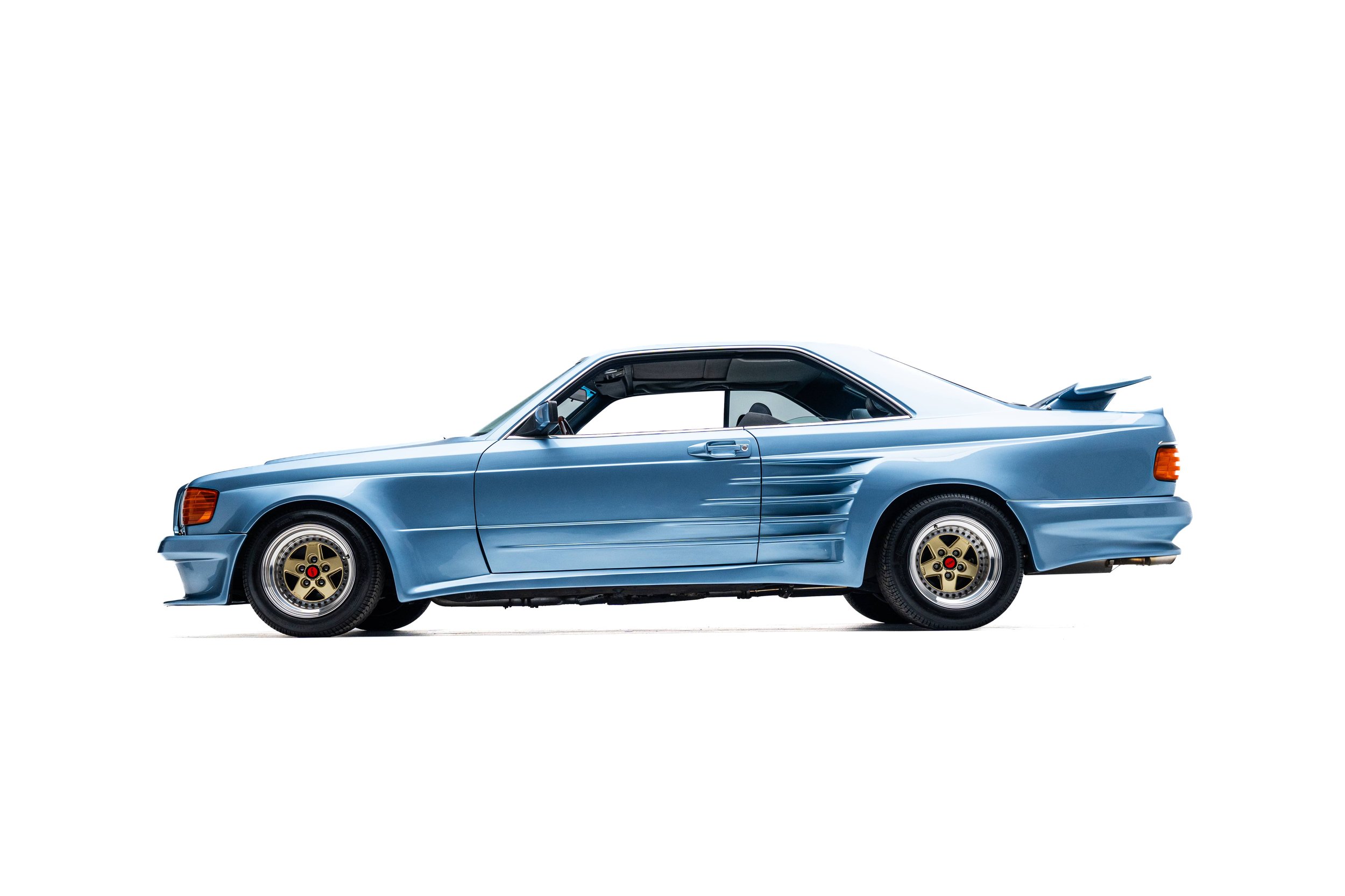 The SEC was the coupe version of the Mercedes-Benz S-class, the company's flagship and most luxurious model. Offered from 1985 to 1991, the 560SEC was the most expensive car in the Mercedes lineup. It featured a unique design with no side pillars, giving it an uninterrupted profile with the windows down and creating an airy-feeling interior. This, combined with a powerful V-8 engine, made for a sporty driving experience in a top-of-the-line luxury car. This blend of looks and performance made S-Class cars, especially the coupes, popular among aftermarket tuning companies such as AMG, Koenig-Specials, and Carat by Duchatelet. Flaunting one's wealth by transforming an understated grand tourer into an outrageous expression of opulence epitomized the 1980s "greed is good" ethos. This 560SEC was modified by German tuning company ABC Exclusive with custom paint, emblems, aftermarket wheels, a hood scoop, rear spoiler, and an exaggerated widebody kit with strakes reminiscent of the Ferrari Testarossa.